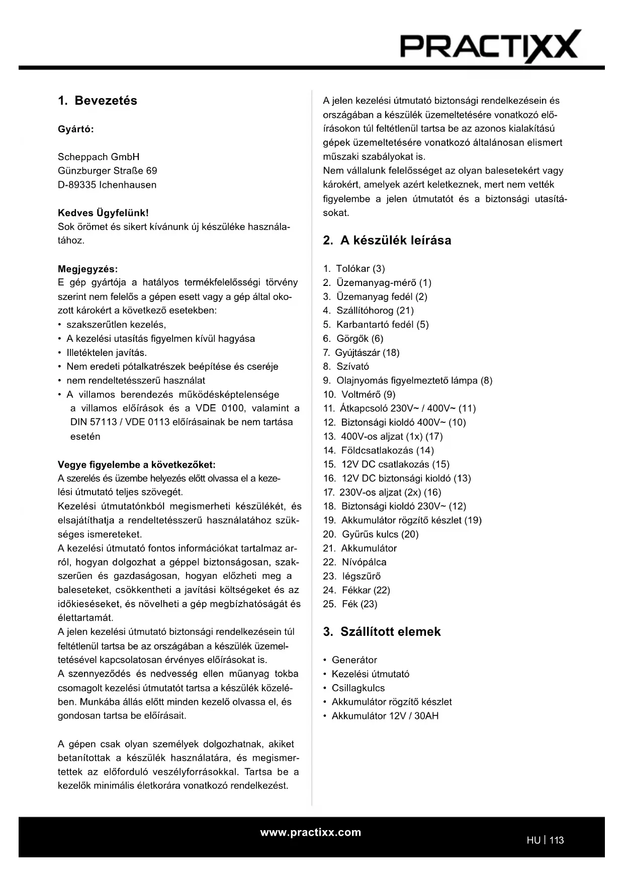 - A villamos berendezés működésképtelensége a villamos előírások és a VDE 0100, valamint a DIN 57113 / VDE 0113 előírásainak be nem tartása esetén Vegye gyelembe a következőket: A szerelés és üzembe helyezés előtt olvassa el a keze- lési útmutató teljes szövegét. Kezelési útmutatónkból megismerheti készülékét, és elsajátíthatja a rendeltetésszerű használatához szük- séges ismereteket. A kezelési útmutató fontos információkat tartalmaz ar- ról, hogyan dolgozhat a géppel biztonságosan, szak- szerűen és gazdaságosan, hogyan előzheti meg a baleseteket, csökkentheti a javítási költségeket és az időkieséseket, és növelheti a gép megbízhatóságát és élettartamát. A jelen kezelési útmutató biztonsági rendelkezésein túl feltétlenül tartsa be az országában a készülék üzemel- tetésével kapcsolatosan érvényes előírásokat is. A szennyeződés és nedvesség ellen műanyag tokba csomagolt kezelési útmutatót tartsa a készülék közelé- ben. Munkába állás előtt minden kezelő olvassa el, és gondosan tartsa be előírásait. A gépen csak olyan személyek dolgozhatnak, akiket betanítottak a készülék használatára, és megismer- tettek az előforduló veszélyforrásokkal. Tartsa be a kezelők minimális életkorára vonatkozó rendelkezést.w ww.practixx.com