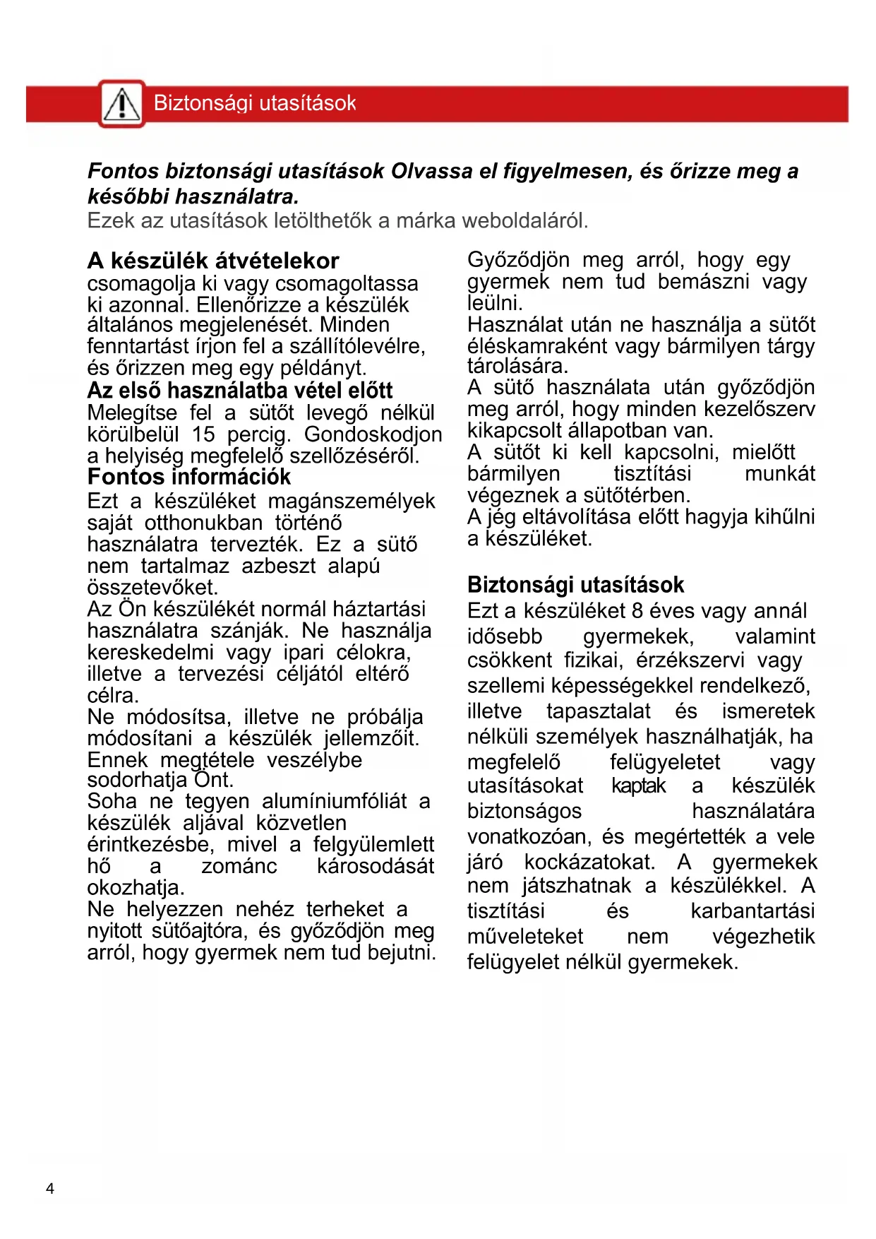 A készülék és a hozzáférhető részei használat közben felforrósodnak. Vigyázzon, hogy ne érintse meg a sütő belsejében lévő fűtőelemeket. A 8 év alatti gyermekeket távol kell tartani, kivéve, ha állandó felügyelet alatt állnak.