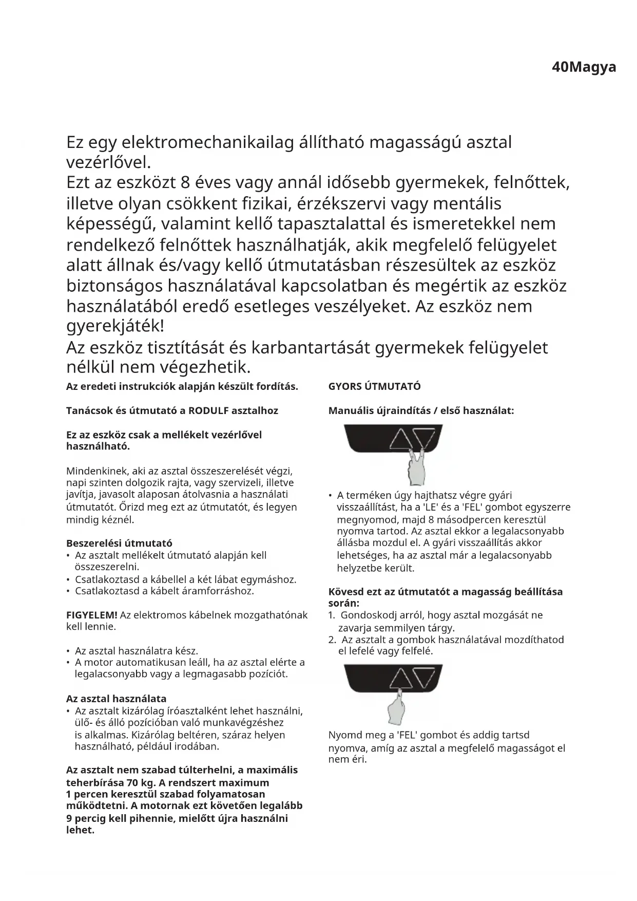 - Cseréld ki a hibás alkatrészt, majd csatlakoztasd újra az áramforráshoz az asztalt. Az asztal ezután újra használható. Ha az asztal továbbra sem működik, vedd fel a kapcsolatot az IKEA Vevőszolgálatával. Atermékszervízelése Ne próbáld megjavítani a készüléket, mivel a burkolat felnyitásával vagy eltávolításával veszélyes feszültségnek vagy más kockázatoknak teheted ki magadat. Az EU Megfelelőségi Nyilatkozatot a csomagolás tartalmazza külön dokumentumként. Gyártó:IKEAofSwedenAB Cím:Box702,SE-34381Älmhult,Svédország Telefon:+46(0)476-648500 ŐRIZDMEGEZTAZÚTMUTATÓT. Az áthúzott, kerekes szemetest ábrázoló szimbólum azt jelzi, hogy a terméket a háztartási hulladéktól különválasztva kell elhelyezni. A terméket a helyi szabályozásnak megfelelően, újrahasznosítás céljából a megfelelő helyen kell leadni. Azzal, hogy az így jelölt termékeket a háztartási hulladéktól különválasztod, segítesz csökkenteni a hulladékégetőkbe kerülő vagy a földben elhelyezett szemét mennyiségét, ezzel minimalizálod az egészségre és a környezetre ártalmas lehetséges negatív hatásokat. További információkért kérjük, lépj kapcsolatba a legközelebbi IKEA áruházzal!42 Műszakiadatok Modell: RODULF asztal, ülő/álló 140x80 cm Típusszám: RODULF-GF-470 Bemenetifeszültség: 100–240 V AC 50/60 Hz, 3.2-1.5 A Áramfogyasztáskészenlétiállapotban: <0.1 W Használatihőmérséklet-tartomány: 10 °C-tól 40 °C-ig Tárolásihőmérséklettartomány: -18°C-tól 70°C-ig Működésipáratartalom: 20–90 % RH 40 °C-on Zajszint: <50 dB(A) Állíthatómagasság: 68–115 cm Maximálisterhelés: 70 kg Hibaelhárításiútmutató FIGYELEM! Mindig áramtalanítsd a kábelt mielőtt karbantartást végzel vagy megtisztítod! Hibajellege Ellenőrzés Próba Az asztal nem mozdítható. Gondoskodj róla, hogy minden kábel megfelelően csatlakoztatva legyen. Csatlakoztasd a kábeleket. Kövesd a szerelési útmutatót és indítsd újra a rendszert. Húzd ki az asztal kábelét a konnektorból, majd egy perccel később dugd be újra. Csak az egyik láb mozog. Indítsd újra a rendszert. Ha a probléma ezután is fennáll, cseréld ki azt a lábat, amelyik nem mozog. A lábak különböző sebességgel mozognak. A lassabbik elemet kézi erővel is lehet óvatosan húzni vagy tolni. Cseréld ki a lassabban mozgó elemet. A lassabbik elemet kézi erővel nem lehet óvatosan húzni vagy tolni. Cseréld ki a gyorsabban mozgó elemet. Az asztal csak kisebb mozdulatokat végez. Gondoskodj arról, hogy az asztal ne legyen túlterhelve. Pakolj le az asztalról. Ha a probléma még mindig fennáll, cseréld ki a vezérlőt. Az asztal megáll, majd visszafelé mozog. Bizonyosodj meg arról, hogy semmi nem blokkolja az asztal mozgását. Távolítsd el a tárgyat, ami gátolja az asztalt a mozgásban. Ha a probléma továbbra is fennáll, cseréld ki az alsóvázat. Az asztal nem tud teljesen lesüllyedni vagy felemelkedni. Ellenőrizd a csatlakozókat. Indítsd újra a rendszert Az asztal csak egy irányba tud mozogni. Az asztal nem teljesen vízszintes. .43Polski Przetłumaczonozoryginalnychinstrukcji. PoradyiinstrukcjedotycząceRODULF. Biurkopowinnobyćużywanetylkoz dołączonymsterownikiem. Każda osoba, która instaluje, używa, naprawia lub serwisuje to biurko, jest odpowiedzialna za uważne przeczytanie niniejszej instrukcji. Przechowuj instrukcję w pobliżu biurka do siedzenia/stania. Instrukcjamontażu