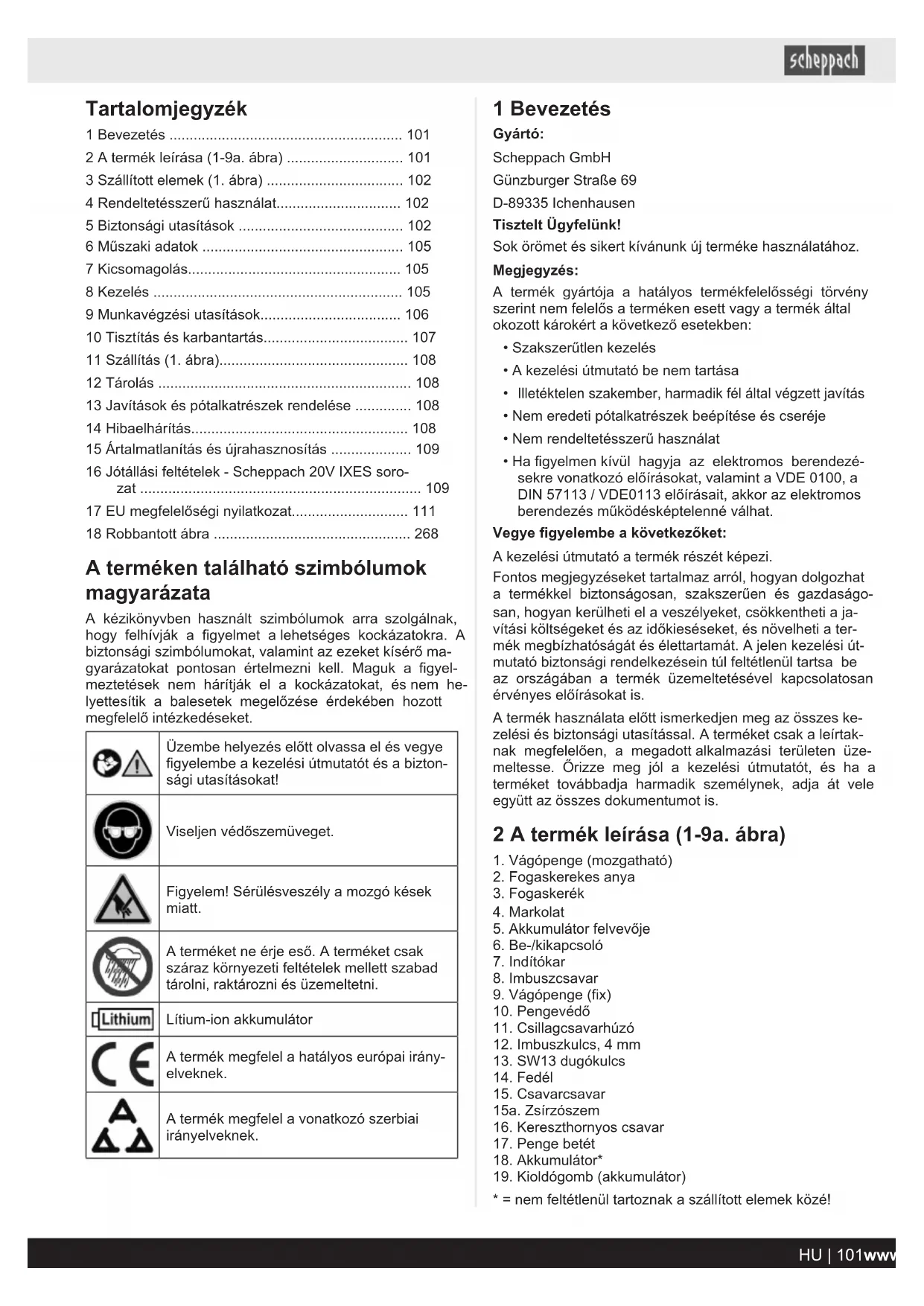 - 18 Robbantott ábra A terméken található szimbólumok magyarázata A kézikönyvben használt szimbólumok arra szolgálnak, hogy felhívják a figyelmet a lehetséges kockázatokra. A biztonsági szimbólumokat, valamint az ezeket kísérő ma- gyarázatokat pontosan értelmezni kell. Maguk a figyel- meztetések nem hárítják el a kockázatokat, és nem he- lyettesítik a balesetek megelőzése érdekében hozott megfelelő intézkedéseket. Üzembe helyezés előtt olvassa el és vegye figyelembe a kezelési útmutatót és a bizton- sági utasításokat! Viseljen védőszemüveget. Figyelem! Sérülésveszély a mozgó kések miatt. A terméket ne érje eső. A terméket csak száraz környezeti feltételek mellett szabad tárolni, raktározni és üzemeltetni. Lítium-ion akkumulátor A termék megfelel a hatályos európai irány- elveknek. A termék megfelel a vonatkozó szerbiai irányelveknek. 1 Bevezetés Gyártó: Scheppach GmbH Günzburger Straße 69 D-89335 Ichenhausen Tisztelt Ügyfelünk! Sok örömet és sikert kívánunk új terméke használatához. Megjegyzés: A termék gyártója a hatályos termékfelelősségi törvény szerint nem felelős a terméken esett vagy a termék által okozott károkért a következő esetekben: p. 268