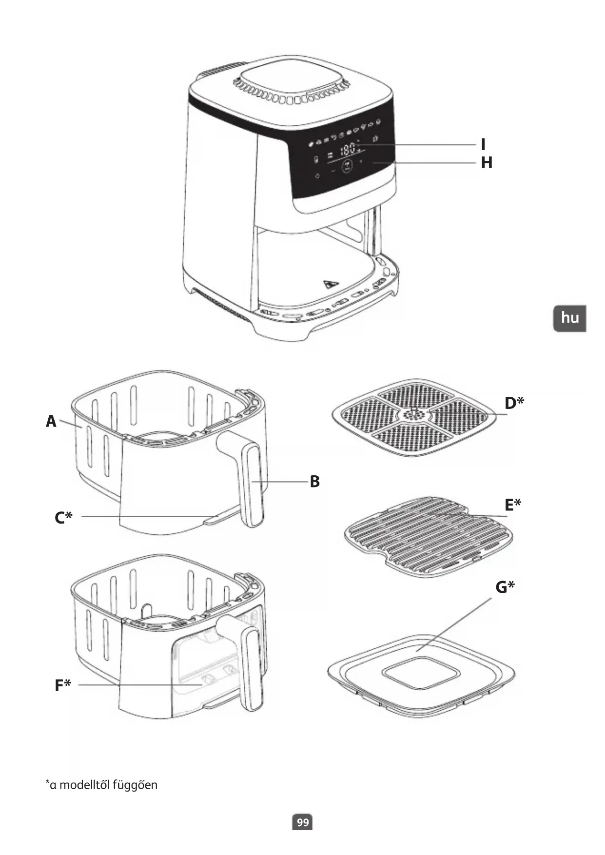 A. Tál B. Tál fogantyúja C. Leválasztható előlap* D. Kivehető rács* E. Kivehető öntött grillrács* F. Leválasztható előlap kémlelőablakkal* G. Tárolási fedél* H. Digitális érintőképernyős panel