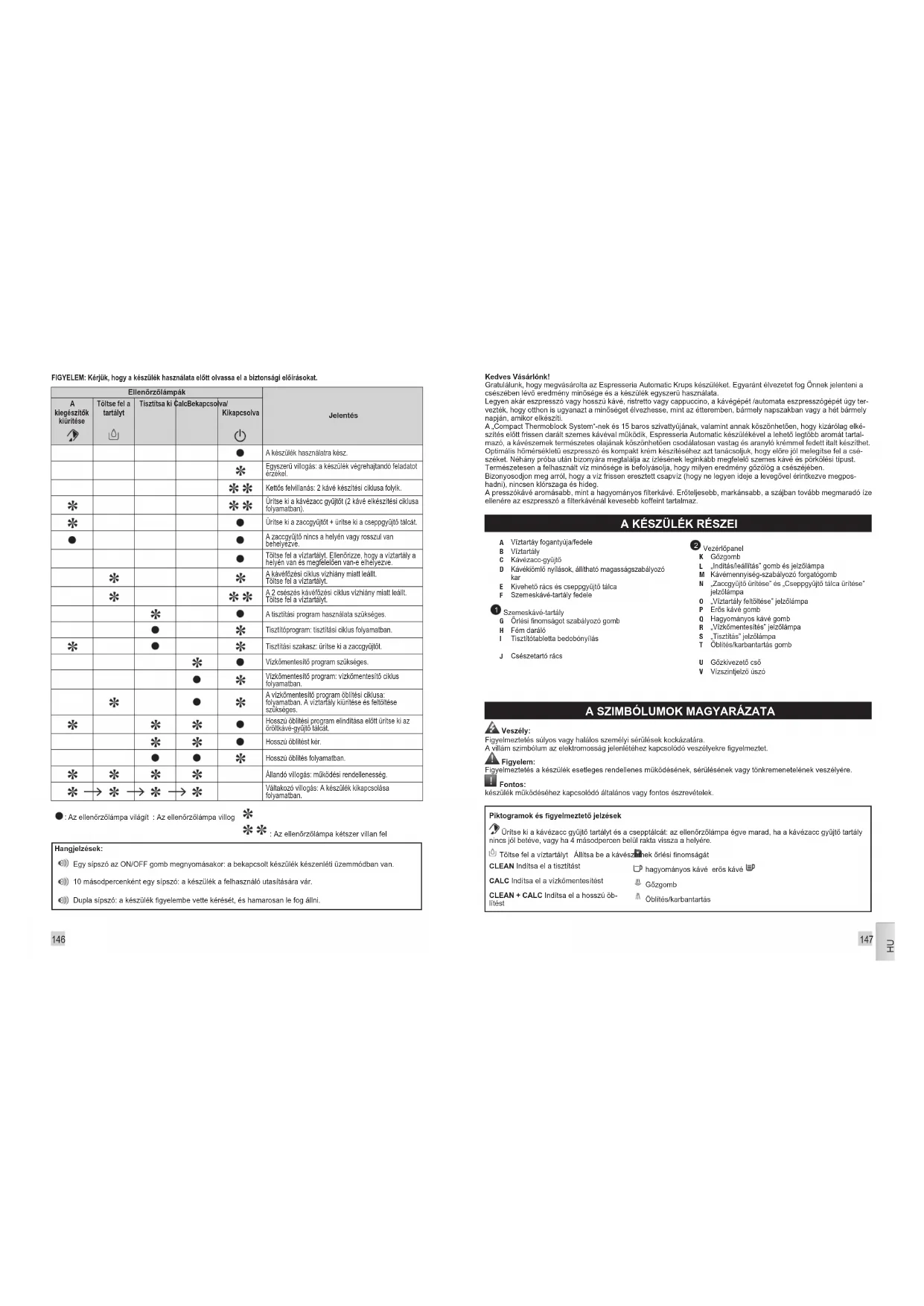 jelzőfény égve marad, és a CLEAN fény kialszik. Ürítse ki a csepegtető tálcát. A készülék most már ismét készen áll a használatra. Fontos: A készülék kérését követően nem kell azonnal futtatni a tisztítóprogramot, de a lehető leghamarabb el kell indítani azt. A tisztítási művelet elhalasztásakor a gyelmeztetés mindaddig látható marad, amíg a műveletet végre nem hajtja. Ha tisztítás közben vagy elektromos hiba esetén kihúzza a készülék csatlakozódugóját a fali aljzatból, vagy kikapcsolja a készüléket, a tisztítóprogram az éppen aktuális lépéstől folytatódik. Ezt a műveletet nem lehet elhalasztani: a vízkör öblítése kötelező. Ha a program elindításakor nincs elég víz a tartályban, akkor a light will jelzőfény kigyulladása gyelmeztet erre. Töltse a tartályba a tartályba a szükséges mennyiségű vizet, és a tisztítási művelet automatikusan folytatódik. Amennyiben a tisztítás során kihúzza a készülék elektromos csatlakozóját, megnyomja a vagy áramellá- tási hiba lép fel, a tisztítóprogram újrakezdődik. Ebben az esetben másik tisztítótablettára lesz szükség. Ké- szüléke megóvása érdekében teljes egészében végezze el a tisztító programot. A tisztítási ciklus nem folyamatos ciklus, a ciklus alatt ne tegye a kezét az „E ” és „W” vízkiömlők alá. Kizárólag KRUPS (XS 3000) tisztítótablettákat használjon. A más márkájú tabletták használatából eredő károkért semmi- lyen felelősséget nem vállalunk. A tisztítótablettákat a KRUPS vevőszolgálatától szerezheti be. Vízkőmentesítési program teljes időtartama: körülbelül 20 perc A lerakódott vízkő mennyisége a használt víz keménységétől függ. A vízkőmentesítés szükségességére a készülék a „CALC” ellenőrzőlámpa villogásával automatikusan gyelmeztet. A program csak akkor futtatható, ha a készülék kéri. A jótállási feltételek betartásához minden esetben, amikor a gép kéri, végezze el a vízkőmentesítési ciklust. Tartsa be a műveletek sorrendjét. A jelzőfény kigyulladását követően továbbra is használhatja a készüléket, de ta- nácsos a program mielőbbi lefuttatása.153