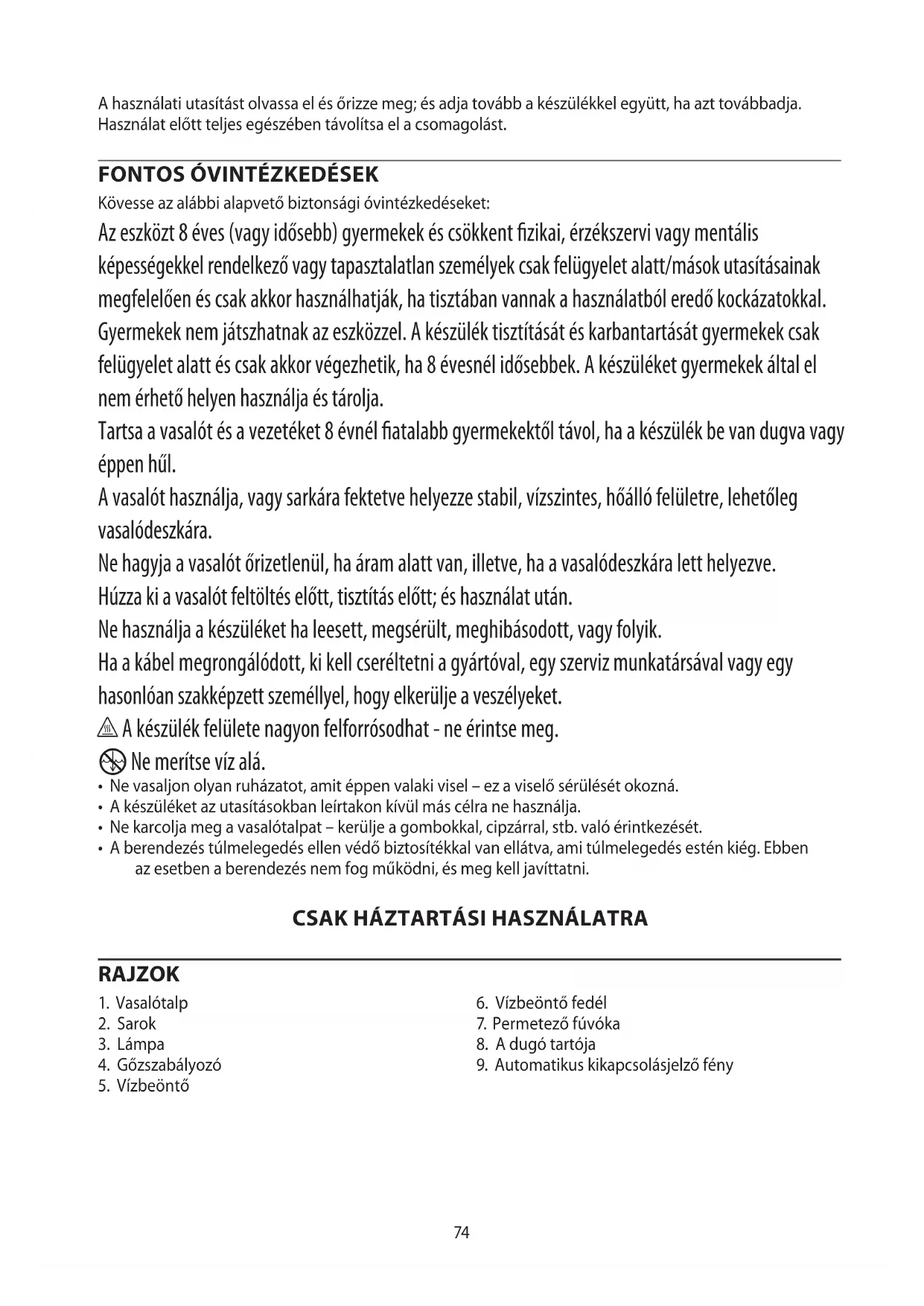 Kövesse az alábbi alapvető biztonsági óvintézkedéseket: Az eszközt 8 éves (vagy idősebb) gyermekek és csökkent fizikai, érzékszervi vagy mentális képességekkel rendelkező vagy tapasztalatlan személyek csak felügyelet alatt/mások utasításainak megfelelően és csak akkor használhatják, ha tisztában vannak a használatból eredő kockázatokkal. Gyermekek nem játszhatnak az eszközzel. A készülék tisztítását és karbantartását gyermekek csak felügyelet alatt és csak akkor végezhetik, ha 8 évesnél idősebbek. A készüléket gyermekek által el nem érhető helyen használja és tárolja. Tartsa a vasalót és a vezetéket 8 évnél fiatalabb gyermekektől távol, ha a készülék be van dugva vagy éppen hűl. A vasalót használja, vagy sarkára fektetve helyezze stabil, vízszintes, hőálló felületre, lehetőleg vasalódeszkára. Ne hagyja a vasalót őrizetlenül, ha áram alatt van, illetve, ha a vasalódeszkára lett helyezve. Húzza ki a vasalót feltöltés előtt, tisztítás előtt; és használat után. Ne használja a készüléket ha leesett, megsérült, meghibásodott, vagy folyik. Ha a kábel megrongálódott, ki kell cseréltetni a gyártóval, egy szerviz munkatársával vagy egy hasonlóan szakképzett személlyel, hogy elkerülje a veszélyeket. h A készülék felülete nagyon felforrósodhat - ne érintse meg.