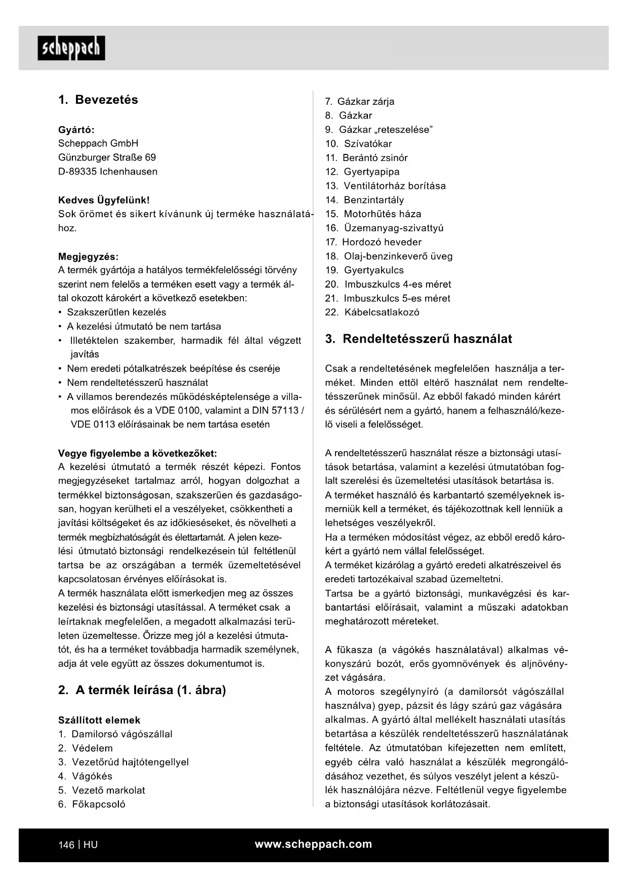 - Ne járassa a motort beltérben. A kipufogógázok mérgező szénmonoxidot tartalmaznak. Figyelem! A felhasználó testi épségének veszélyez- tetése miatt a benzinmotoros fűkasza nem használ- ható a következő munkákra: járdák tisztítására és szecskázóként fa- és sövénynyesedékek aprítására. A benzinmotoros fűkaszát továbbá nem szabad a talaj kitüremkedéseinek, pl. vakondtúrásoknak az elegyen- getésére használni. A benzinmotoros fűkaszát bizton- sági okokból nem szabad meghajtó aggregátként más munkaeszközökkel vagy bármilyen egyéb szerszám- készlettel használni. A gépet csak rendeltetésszerűen szabad használni. Minden ettől eltérő használat nem rendeltetésszerű- nek minősül. Az ebből fakadó minden kárért és sérü- lésért nem a gyártó, hanem a felhasználó/kezelő viseli a felelősséget. Ki nem használhatja a készüléket: Olyan személyek, akik nem ismerik a kezelési útmuta- tót, 16 éves kor alatti gyermekek, valamint alkohol, ká- bítószer vagy gyógyszer hatása alatt álló személyek. A benzinmotoros fűkasza használati időszaka Noha a motoros fűkaszát bármikor szabad használ- ni, a kezelőnek tekintettel kell lennie a környezetében tartózkodó többi emberre. Kérjük, vegye gyelembe, hogy termékeinket rendelte- tésük szerint nem kisipari, kéziipari vagy ipari haszná- latra tervezték. A termékre semmilyen garanciát nem vállalunk, ha kisipari, kéziipari vagy ipari, valamint ezekkel egyenértékű tevékenységekhez használja. A gyártó nem vállal felelősséget azokért a károkért, amelyeket a nem rendeltetésszerű használat vagy a helytelen kezelés okoz. A kezelési útmutatóban használt jelzőszavak ma- gyarázata m VESZÉLY Ez a jelzőszó olyan közvetlenül fenyegető veszélyes helyzetre utal, amely súlyos sérülést vagy halálos balesetet okoz, ha nem kerülik el. m FIGYELMEZTETÉS Ez a jelzőszó olyan lehetséges veszélyhelyzetre utal, amely súlyos sérülést vagy halálos balesetet okozhat, ha nem kerülik el.www.scheppach.com