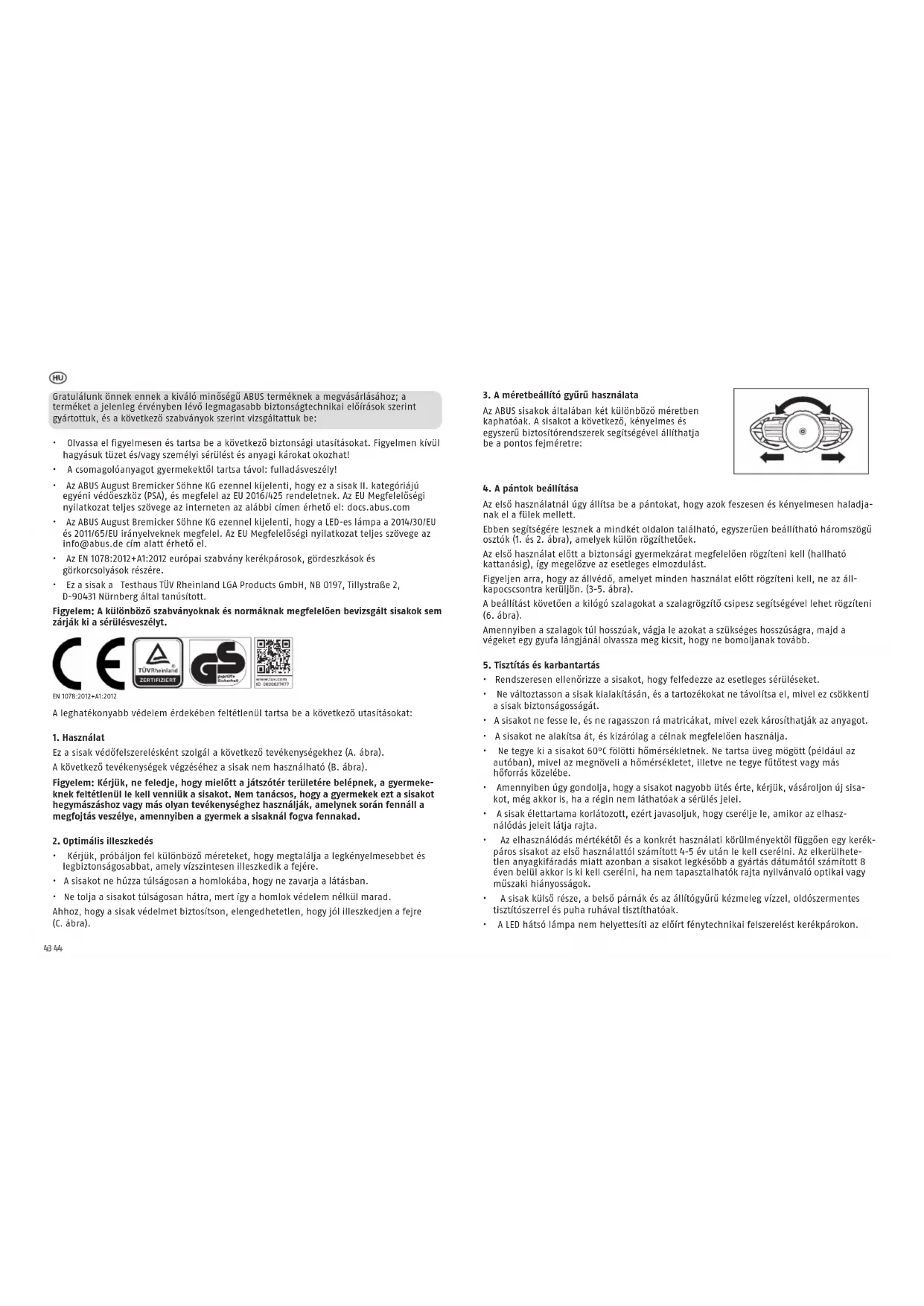 - Az ABUS August Bremicker Söhne KG ezennel kijelenti, hogy ez a sisak II. kategóriájú egyéni védőeszköz (PSA), és megfelel az EU 2016/425 rendeletnek. Az EU Megfelelőségi nyilatkozat teljes szövege az interneten az alábbi címen érhető el: docs.abus.com
