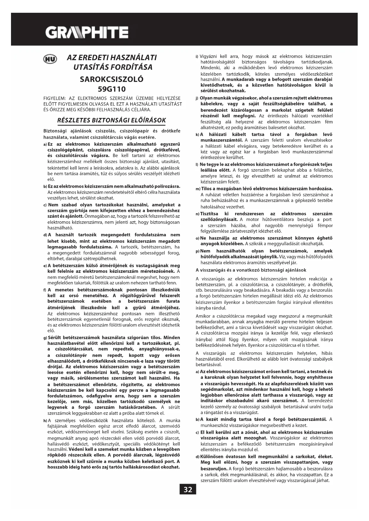 SAROKCSISZOLÓ 59G110 FIGYELEM: AZ ELEKTROMOS SZERSZÁM ÜZEMBE HELYEZÉSE ELŐTT FIGYELMESEN OLVASSA EL EZT A HASZNÁLATI UTASÍTÁST ÉS ŐRIZZE MEG KÉSŐBBI FELHASZNÁLÁS CÉLJÁRA. RÉSZLETES BIZTONSÁGI ELŐÍRÁSOK Biztonsági ajánlások csiszolás, csiszolópapír és drótkefe használata, valamint csiszolótárcsás vágás esetére. a) Ez az elektromos kéziszerszám alkalmazható egyszerű csiszológépként, csiszolásra csiszolópapírral, drótkefével, és csiszolótárcsás vágásra. Be kell tartani az elektromos kéziszerszámhoz mellékelt összes biztonsági ajánlást, utasítást, tekintettel kell lenni a leírásokra, adatokra is. Az alábbi ajánlások be nem tartása áramütés, tűz és súlyos sérülés veszélyét idézheti elő. b) Ez az elektromos kéziszerszám nem alkalmazható polírozásra. Az elektromos kéziszerszám rendetetésétől eltérő célra használata veszélyes lehet, sérülést okozhat. c) Nem szabad olyan tartozékokat használni, amelyeket a szerszám gyártója nem kifejezetten ehhez a berendezéshez szánt és ajánlott. Önmagában az, hogy a tartozék felszerelhető az elektromos kéziszerszámra, nem jelenti azt, hogy biztonságosan használható. d) A használt tartozék megengedett fordulatszáma nem lehet kisebb, mint az elektromos kéziszerszám megadott legmagasabb fordulatszáma. A tartozék, betétszerszám, ha a megengedett fordulatszámnál nagyobb sebességgel forog, eltörhet, darabjai szétrepülhetnek. e) A betétszerszám külső átmérőjének és vastagságának meg kell felelnie az elektromos kéziszerszám méretezésének. A nem megfelelő méretű betétszerszámoknál megeshet, hogy nem megfelelően takartak, fölöttük az uralom nehezen tartható fenn. f) A menetes betétszerszámoknak pontosan illeszkedniük kell az orsó menetéhez. A rögzítőgyűrűvel felszerelt betétszerszámok esetében a betétszerszám furata átmérőjének illeszkednie kell a gyűrű átmérőjéhez. Az elektromos kéziszerszámhoz pontosan nem illeszthető betétszerszámok egyenetlenül forognak, erős rezgést okoznak, és az elektromos kéziszerszám fölötti uralom elvesztését idézhetik elő. g) Sérült betétszerszámok használata szigorúan tilos. Minden használatbavétel előtt ellenőrizni kell a tartozékokat, pl. a csiszolótárcsákat, nem repedtek, anyaghiányosak-e, a csiszolótányér nem repedt, kopott vagy erősen elhasználódott, a drótkeféknek nincsenek-e laza vagy törött drótjai. Az elektromos kéziszerszám vagy a betétszerszám leesése esetén ellenőrizni kell, hogy nem sérült-e meg, vagy másik, sérülésmentes szerszámot kell használni. Ha a betétszerszámot ellenőrizte, rögzítette, az elektromos kéziszerszám be kell kapcsolni egy percre a legmagasabb fordulatszámon, odagyelve arra, hogy sem a szerszám kezelője, sem más, közelben tartózkodó személyek ne legyenek a forgó szerszám hatáskörzetében. A sérült szerszámok leggyakrabban ez alatt a próba alatt törnek el. h) A személyes védőeszközök használata kötelező. A munka fajtájának megfelelően egész arcot elfedő álarcot, szemvédő eszközt, védőszemüveget kell viselni. Szükség esetén a csiszolt, megmunkált anyag apró részecskéi ellen védő porvédő álarcot, hallásvédő eszközt, védőkesztyűt, speciális védőkötényt kell használni. Védeni kell a szemeket munka közben a levegőben röpködő részecskék ellen. A porvédő álarcnak, légzésvédő eszköznek ki kell szűrnie a munka közben keletkező port. A hosszabb ideig ható erős zaj tartós halláskárosodást okozhat.