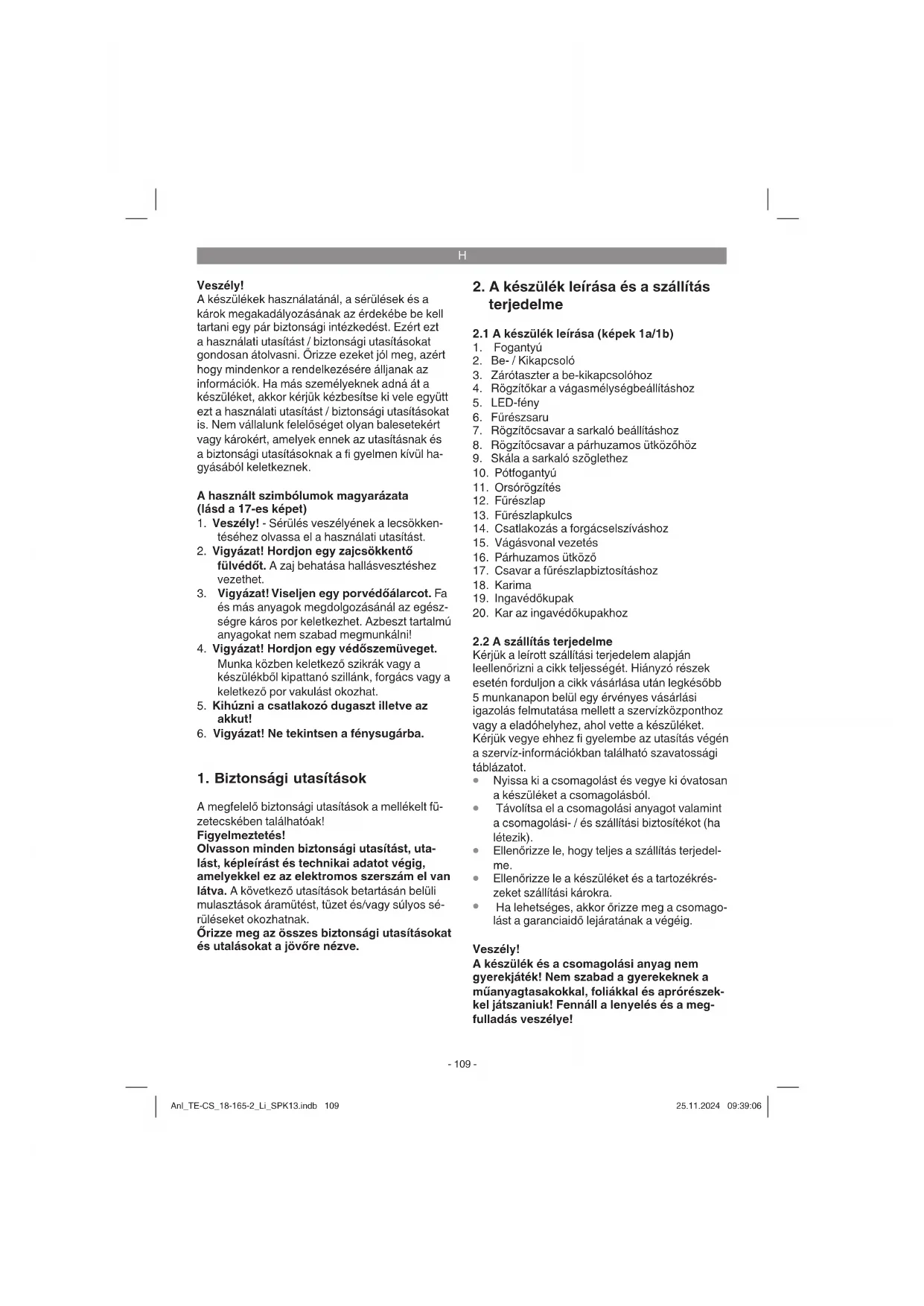 Ha lehetséges, akkor őrizze meg a csomago- lást a garanciaidő lejáratának a végéig. Veszély! A készülék és a csomagolási anyag nem gyerekjáték! Nem szabad a gyerekeknek a műanyagtasakokkal, foliákkal és aprórészek- kel játszaniuk! Fennáll a lenyelés és a meg- fulladás veszélye! Anl_TE-CS_18-165-2_Li_SPK13.indb 109Anl_TE-CS_18-165-2_Li_SPK13.indb 109 25.11.2024 09:39:0625.11.2024 09:39:06H