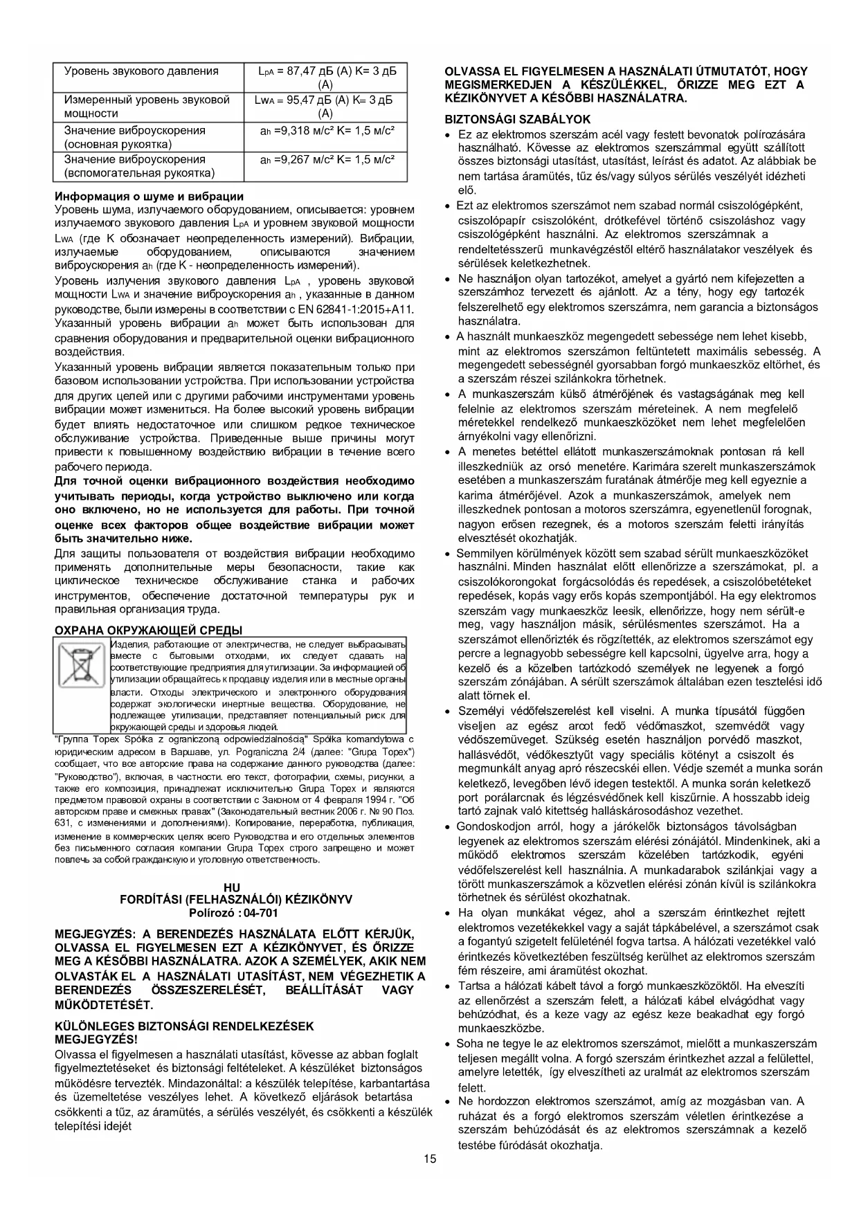 Hangnyomásszint LpA = 87,47dB (A) K= 3dB(A) Mérhető hangteljesítményszint LwA = 95,47dB (A) K= 3dB(A) Rezgésgyorsulás értéke (fő fogantyú) ah =9,318 m/s² K= 1,5 m/s² Rezgésgyorsulás értéke (segédfogantyú) ah =9,267 m/s² K= 1,5 m/s² A zajjal és rezgéssel kapcsolatos információk A berendezés zajkibocsátási szintjét a következőkkel írják le: a kibocsátott hangnyomásszint LpA és a hangteljesítményszint LWA (ahol K a mérési bizonytalanságot jelöli). A berendezés által kibocsátott rezgéseket ah rezgésgyorsulás értéke írja le (ahol K a mérési bizonytalanságot jelöli). Az ebben a kézikönyvben megadott LpA hangnyomás-kibocsátási szintet, az LWA hangteljesítményszintet és az ah rezgésgyorsulási értéket az EN 62841-1:2015+A11 szabvány szerint mértük. A megadott ah rezgésszint a használható a berendezések összehasonlítására és a rezgésexpozíció előzetes értékelésére. A megadott rezgésszint csak a készülék alapvető használatára jellemző. Ha a készüléket más alkalmazásokhoz vagy más munkaeszközökkel együtt használják, a rezgésszint változhat. A magasabb rezgésszintet az egység elégtelen vagy túl ritkán végzett karbantartása befolyásolja. A fent említett okok a teljes munkaidő alatt megnövekedett rezgéskitettséget eredményezhetnek. A rezgésexpozíció pontos becsléséhez figyelembe kell venni azokat az időszakokat, amikor a készülék ki van kapcsolva, vagy amikor be van kapcsolva, de nem használják munkára. Ha minden tényezőt pontosan becsülünk meg, a teljes rezgésexpozíció jelentősen alacsonyabb lehet. A vibráció hatásaitól való védelem érdekében további biztonsági intézkedéseket kell bevezetni, mint például a gép és a munkaeszközök ciklikus karbantartása, a megfelelő kézhőmérséklet biztosítása és a megfelelő munkaszervezés.