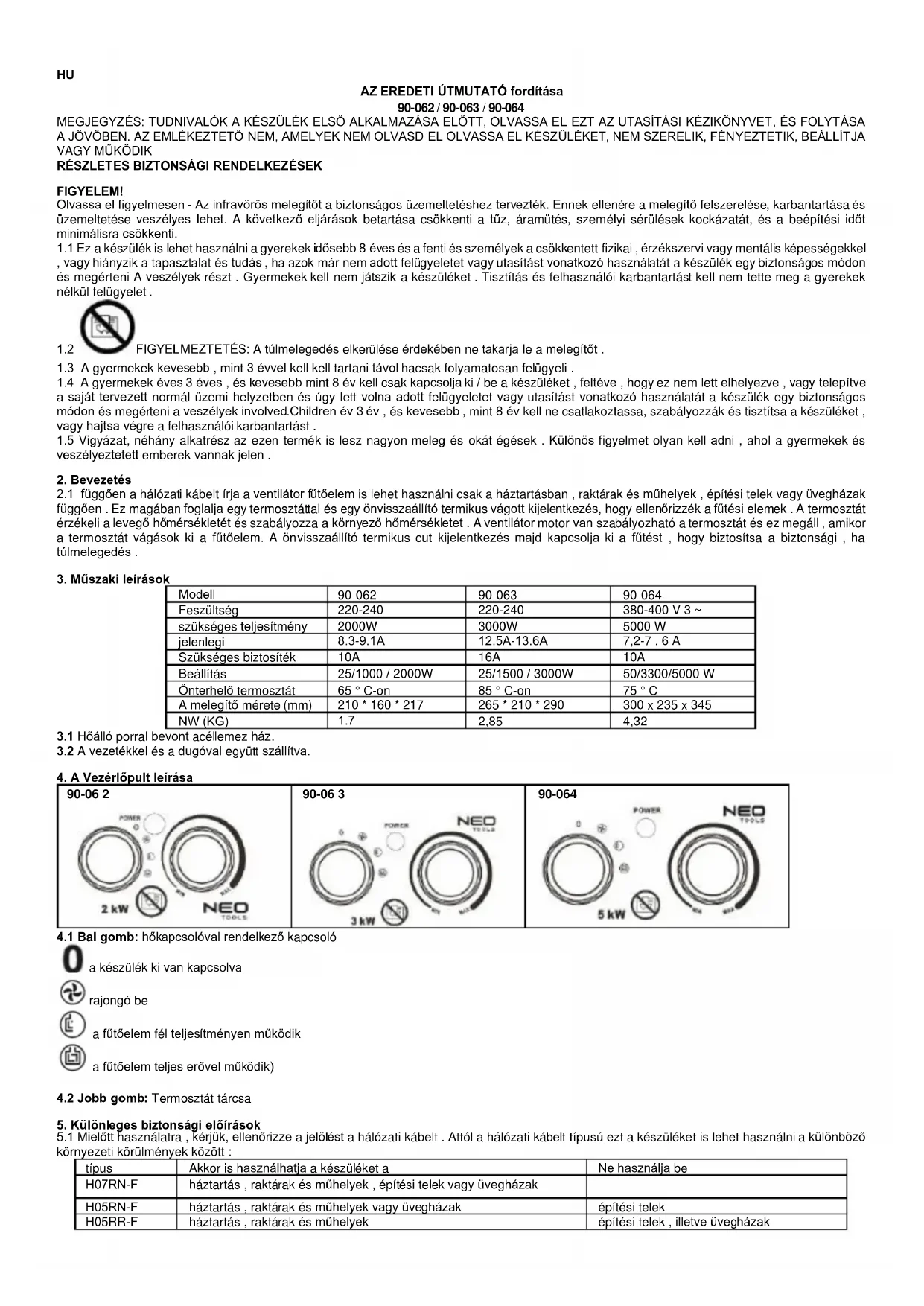 H05RN-F háztartás , raktárak és műhelyek vagy üvegházak építési telek H05RR-F háztartás , raktárak és műhelyek építési telek , illetve üvegházak5.2 Elektromos készülék használatakor az alapvető óvintézkedéseket mindig be kell tartani, beleértve az alábbiakat: 5.2.1 A ventilátoros fűtés nem alkalmas nedves időben, fürdőszobában vagy más nedves vagy nedves környezetben történő kültéri használatra. 5.2.2 Felhívjuk figyelmét, hogy a ventilátor melegítése nagyon felforrósodhat, ezért biztonságos távolságra kell helyezni a gyúlékony tárgyaktól, például bútoroktól, függönyöktől és hasonlóktól.
