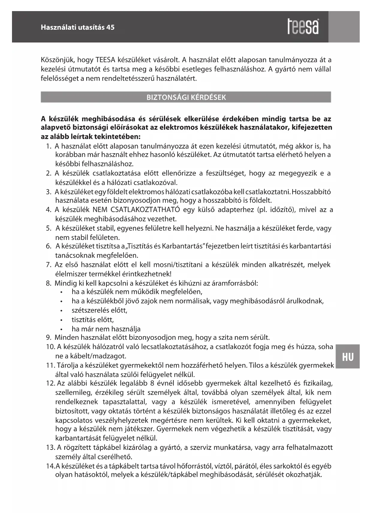 Köszönjuk, hovy TEESA keszüléket vásárolt. A hasznalat elott alaposan tanulmányozza át a kezelési utmutató és tartsa meg a késöbbi esetleges felhasznaláshoz. A gyartó nem vallal felelosséget a nem rendeltetesszerő hasznalatér.