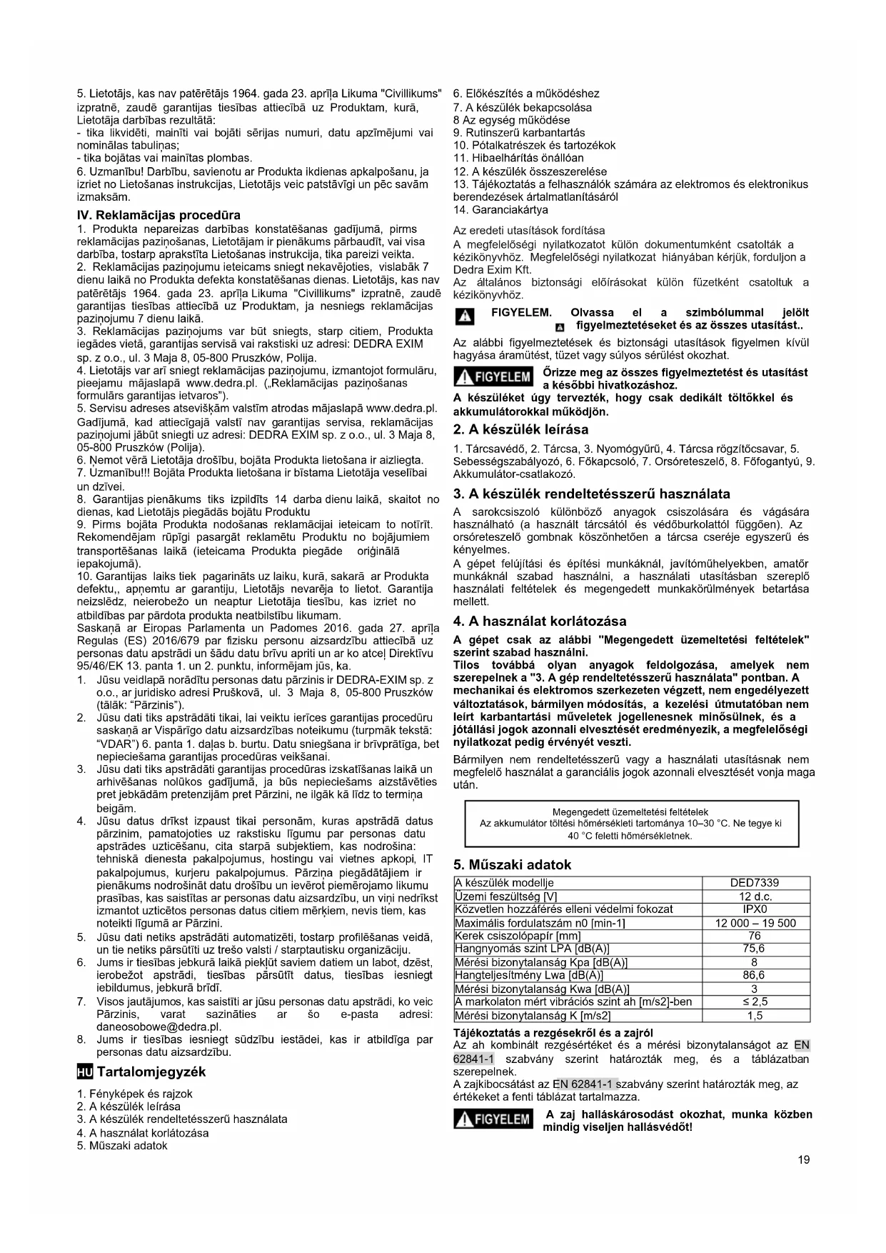 Az eredeti utasítások fordítása A megfelelőségi nyilatkozatot külön dokumentumként csatolták a kézikönyvhöz. Megfelelőségi nyilatkozat hiányában kérjük, forduljon a Dedra Exim Kft. Az általános biztonsági előírásokat külön füzetként csatoltuk a kézikönyvhöz. FIGYELEM. Olvassa el a szimbólummal jelölt figyelmeztetéseket és az összes utasítást.. Az alábbi figyelmeztetések és biztonsági utasítások figyelmen kívül hagyása áramütést, tüzet vagy súlyos sérülést okozhat. Őrizze meg az összes figyelmeztetést és utasítást a későbbi hivatkozáshoz. A készüléket úgy tervezték, hogy csak dedikált töltőkkel és akkumulátorokkal működjön.