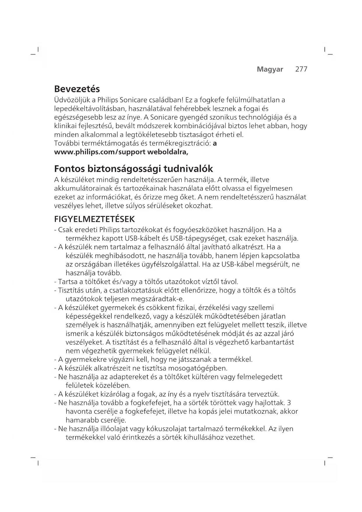 Magyar Bevezetés Üdvözöljük a Philips Sonicare családban! Ez a fogkefe felülmúlhatatlan a lepedékeltávolításban, használatával fehérebbek lesznek a fogai és egészségesebb lesz az ínye. A Sonicare gyengéd szonikus technológiája és a klinikai fejlesztésű, bevált módszerek kombinációjával biztos lehet abban, hogy minden alkalommal a legtökéletesebb tisztaságot érheti el. További terméktámogatás és termékregisztráció: a www.philips.com/support weboldalra, Fontos biztonságossági tudnivalók A készüléket mindig rendeltetésszerűen használja. A termék, illetve akkumulátorainak és tartozékainak használata előtt olvassa el figyelmesen ezeket az információkat, és őrizze meg őket. A nem rendeltetésszerű használat veszélyes lehet, illetve súlyos sérüléseket okozhat. FIGYELMEZTETÉSEK - Csak eredeti Philips tartozékokat és fogyóeszközöket használjon. Ha a termékhez kapott USB-kábelt és USB-tápegységet, csak ezeket használja. - A készülék nem tartalmaz a felhasználó által javítható alkatrészt. Ha a készülék meghibásodott, ne használja tovább, hanem lépjen kapcsolatba az országában illetékes ügyfélszolgálattal. Ha az USB-kábel megsérült, ne használja tovább. - Tartsa a töltőket és/vagy a töltős utazótokot víztől távol. - Tisztítás után, a csatlakoztatásuk előtt ellenőrizze, hogy a töltők és a töltős utazótokok teljesen megszáradtak-e. - A készüléket gyermekek és csökkent fizikai, érzékelési vagy szellemi képességekkel rendelkező, vagy a készülék működtetésében járatlan személyek is használhatják, amennyiben ezt felügyelet mellett teszik, illetve ismerik a készülék biztonságos működtetésének módját és az azzal járó veszélyeket. A tisztítást és a felhasználó által is végezhető karbantartást nem végezhetik gyermekek felügyelet nélkül. - A gyermekekre vigyázni kell, hogy ne játsszanak a termékkel. - A készülék alkatrészeit ne tisztítsa mosogatógépben. - Ne használja az adaptereket és a töltőket kültéren vagy felmelegedett felületek közelében. - A készüléket kizárólag a fogak, az íny és a nyelv tisztítására terveztük. - Ne használja tovább a fogkefefejet, ha a sörték töröttek vagy hajlottak. 3 havonta cserélje a fogkefefejet,illetve ha kopás jelei mutatkoznak, akkor hamarabb cserélje. - Ne használja illóolajat vagy kókuszolajat tartalmazó termékekkel. Az ilyen termékekkel való érintkezés a sörték kihullásához vezethet.278 Magyar - A termék legfeljebb 4500 méteres tengerszint feletti magasságban használható.