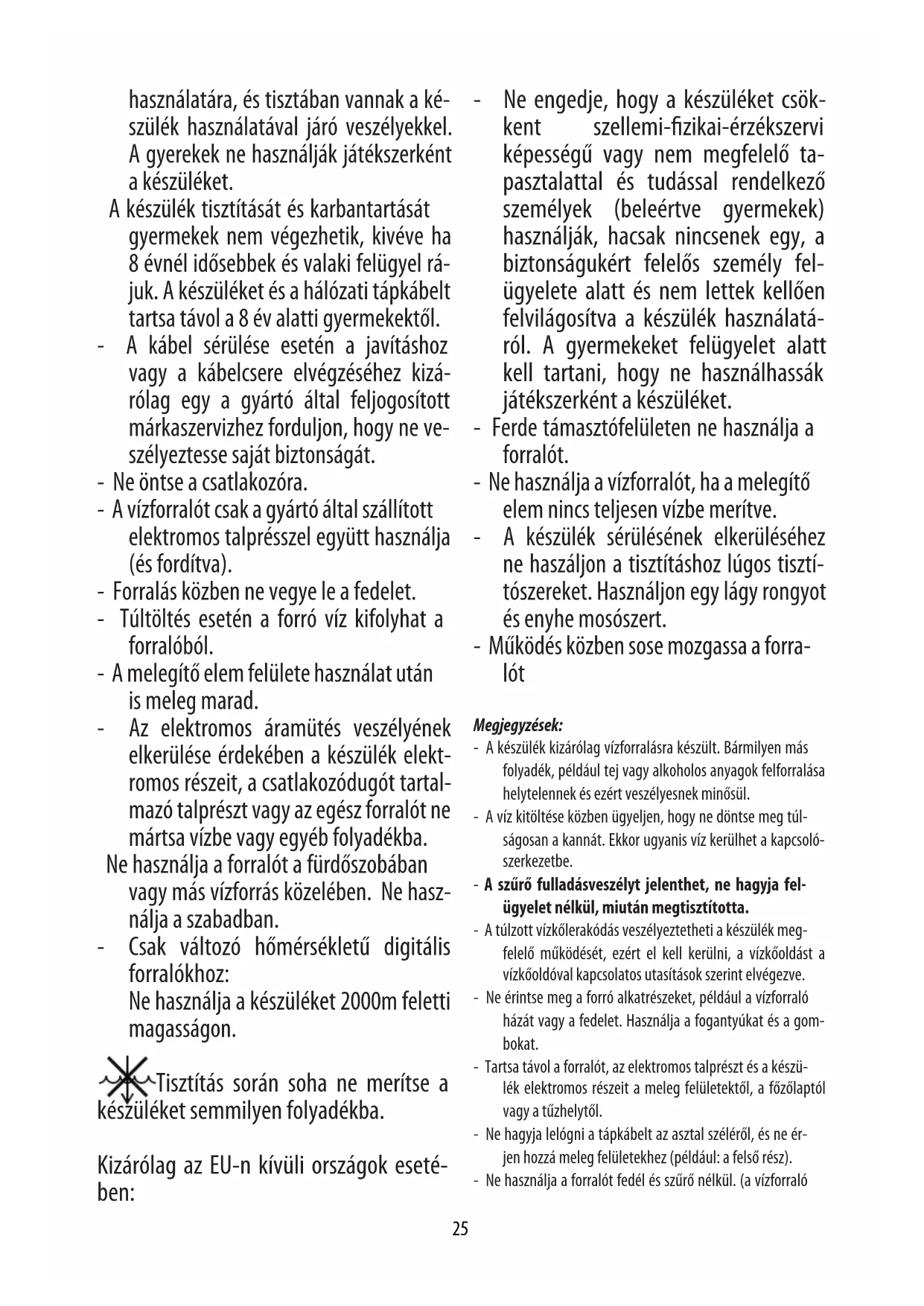 Csak változó hőmérsékletű digitális forralókhoz: Ne használja a készüléket 2000m feletti magasságon. Tisztítás során soha ne merítse a készüléket semmilyen folyadékba. Kizárólag az EU-n kívüli országok eseté- ben: - Ne engedje, hogy a készüléket csök- kent szellemi-zikai-érzékszervi képességű vagy nem megfelelő ta- pasztalattal és tudással rendelkező személyek (beleértve gyermekek) használják, hacsak nincsenek egy, a biztonságukért felelős személy fel- ügyelete alatt és nem lettek kellően felvilágosítva a készülék használatá- ról. A gyermekeket felügyelet alatt kell tartani, hogy ne használhassák játékszerként a készüléket. - Ferde támasztófelületen ne használja a forralót. - Ne használja a vízforralót, ha a melegítő elem nincs teljesen vízbe merítve. - A készülék sérülésének elkerüléséhez ne haszáljon a tisztításhoz lúgos tisztí- tószereket. Használjon egy lágy rongyot és enyhe mosószert. - Működés közben sose mozgassa a forra- lót Megjegyzések: - A készülék kizárólag vízforralásra készült. Bármilyen más folyadék, például tej vagy alkoholos anyagok felforralása helytelennek és ezért veszélyesnek minősül. - A víz kitöltése közben ügyeljen, hogy ne döntse meg túl- ságosan a kannát. Ekkor ugyanis víz kerülhet a kapcsoló- szerkezetbe. - A szűrő fulladásveszélyt jelenthet, ne hagyja fel- ügyelet nélkül, miután megtisztította. - A túlzott vízkőlerakódás veszélyeztetheti a készülék meg- felelő működését, ezért el kell kerülni, a vízkőoldást a vízkőoldóval kapcsolatos utasítások szerint elvégezve. - Ne érintse meg a forró alkatrészeket, például a vízforraló házát vagy a fedelet. Használja a fogantyúkat és a gom- bokat. - Tartsa távol a forralót, az elektromos talprészt és a készü- lék elektromos részeit a meleg felületektől, a főzőlaptól vagy a tűzhelytől. - Ne hagyja lelógni a tápkábelt az asztal széléről, és ne ér- jen hozzá meleg felületekhez (például: a felső rész). - Ne használja a forralót fedél és szűrő nélkül. (a vízforraló26
