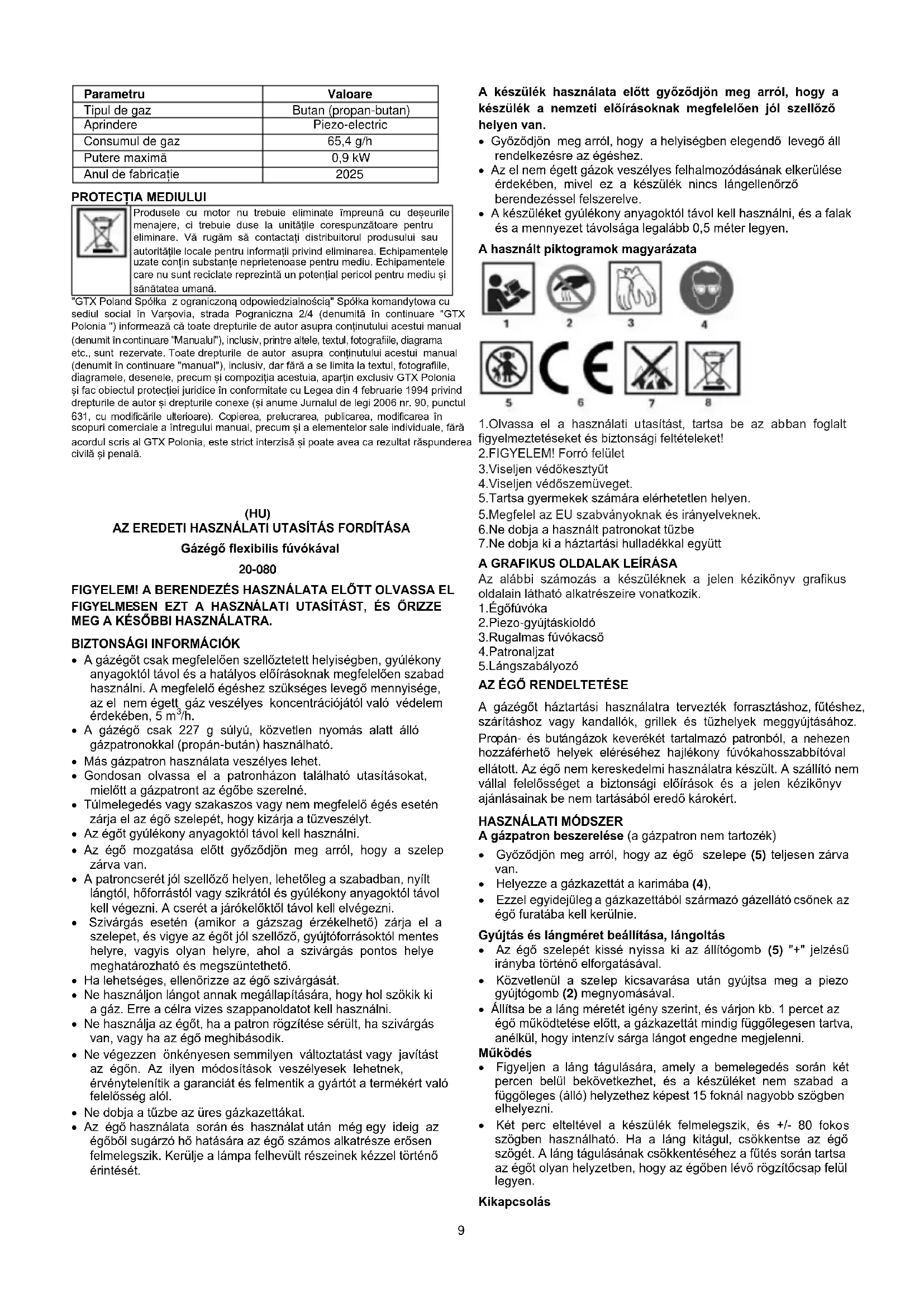 - Az égőtest tisztításához nedves ruhát és oldott szappanos vizet használjon. Soha ne használjon semmiféle súrolószert. Az égő gyártója nem vállal felelősséget az eszköz nem megfelelő használata, a rendeltetéstől eltérő használat, a kezelői szakértelem hiánya, önkényes változtatások vagy javítások elvégzése, illetve a felhasználó által nem eredeti alkatrészek használata által okozott károkért. TECHNIKAI ADATOK 20-080 gázégő Paraméter Érték Gáz típusa Bután (propán-bután) Gyújtás Piezoelektromos Gázfogyasztás 65,4 g/h Maximális teljesítmény 0,9 kW Gyártás éve