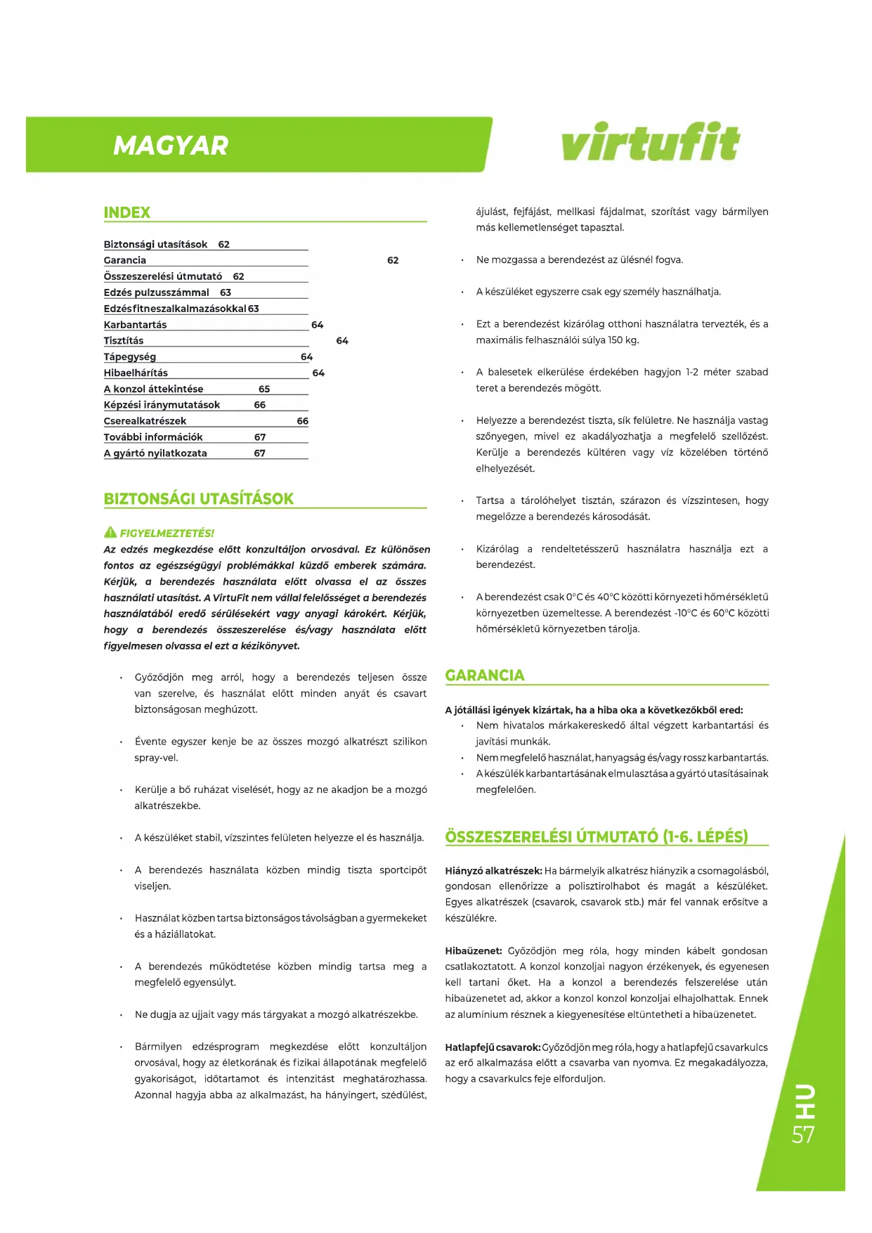 FIGYELMEZTETÉS! Az edzés megkezdése előtt konzultáljon orvosával. Ez különösen fontos az egészségügyi problémákkal küzdő emberek számára. Kérjük, a berendezés használata előtt olvassa el az összes használati utasítást. A VirtuFit nem vállal felelősséget a berendezés használatából eredő sérülésekért vagy anyagi károkért. Kérjük, hogy a berendezés összeszerelése és/vagy használata előtt figyelmesen olvassa el ezt a kézikönyvet.