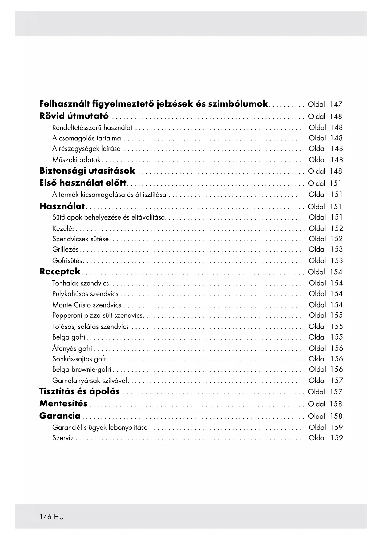 Felhasznált figyelmeztető jelzések és szimbólumok........ . . Oldal 147 Rövid útmutató .................................................. . . Oldal 148 Rendeltetésszerű használat ............................................ . . Oldal 148 A csomagolás tartalma ............................................... . . Oldal 148 A részegységek leírása ............................................... . . Oldal 148 Műszaki adatok ..................................................... . . Oldal 148 Biztonsági utasítások ........................................... . . Oldal 148 Első használat előtt.............................................. . . Oldal 151 A termék kicsomagolása és áttisztítása ................................... . . Oldal 151 Használat......................................................... . . Oldal 151 Sütőlapok behelyezése és eltávolítása.................................... . . Oldal 151 Kezelés............................................................ . . Oldal 152 Szendvicsek sütése................................................... . . Oldal 152 Grillezés........................................................... . . Oldal 153 Gofrisütés.......................................................... . . Oldal 153 Receptek .......................................................... . . Oldal 154 Tonhalas szendvics................................................... . . Oldal 154 Pulykahúsos szendvics ................................................ . . Oldal 154 Monte Cristo szendvics ............................................... . . Oldal 154 Pepperoni pizza sült szendvics.......................................... . . Oldal 155 Tojásos, salátás szendvics ............................................. . . Oldal 155 Belga gofri ......................................................... . . Oldal 155 Áfonyás gofri ....................................................... . . Oldal 156 Sonkás-sajtos gofri ................................................... . . Oldal 156 Belga brownie-gofri .................................................. . . Oldal 156 Garnélanyársak szilvával.............................................. . . Oldal 157 Tisztítás és ápolás ............................................... . . Oldal 157 Mentesítés ........................................................ . . Oldal 158 Garancia .......................................................... . . Oldal 158 Garanciális ügyek lebonyolítása ........................................ . . Oldal 159 Szerviz ............................................................ . . Oldal 159147