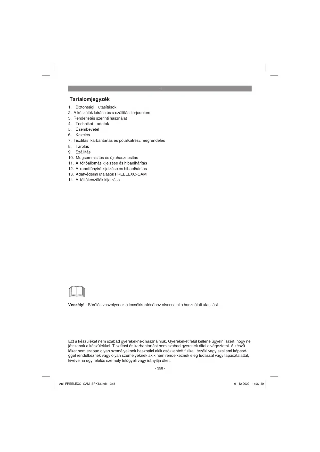 Veszély! - Sérülés veszélyének a lecsökkentéséhez olvassa el a használati utasítást. Ezt a készüléket nem szabad gyerekeknek használniuk. Gyerekeket felül kellene ügyelni azért, hogy ne játszanak a készülékkel. Tisztítást és karbantartást nem szabad gyerekek által elvégeztetni. A készü- léket nem szabad olyan személyeknek használni akik csökkentett fi zikai, érzéki vagy szellemi képesé- ggel rendelkeznek vagy olyan személyeknek akik nem rendelkeznek elég tudással vagy tapasztalattal, kivéve ha egy felelős személy felügyeli vagy irányítja őket. Anl_FREELEXO_CAM_SPK13.indb 358Anl_FREELEXO_CAM_SPK13.indb 358 01.12.2022 15:37:4001.12.2022 15:37:40H