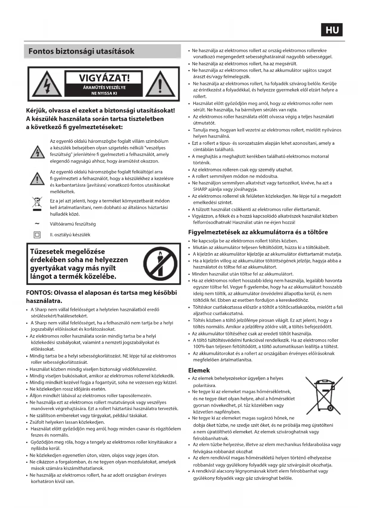 - Tanulja meg, hogyan kell vezetni az elektromos rollert, mielőtt nyilvános helyen használná.• Ezt a rollert a típus- és sorozatszám alapján lehet azonosítani, amely a címtáblán található.• A meghajtás a meghajtott kerékben található elektromos motorral történik.• Az elektromos rolleren csak egy személy utazhat.• A rollert semmilyen módon ne módosítsa.• Ne használjon semmilyen alkatrészt vagy tartozékot, kivéve, ha azt a SHARP ajánlja vagy jóváhagyja.• Az elektromos rollerrel sík felületen közlekedjen. Ne lépje túl a megadott emelkedési szintet.• A túlzott használat csökkenti az elektromos roller élettartamát.• Vigyázzon, a fékek és a hozzá kapcsolódó alkatrészek használat közben felforrósodhatnak! Használat után ne érjen hozzá! Figyelmeztetések az akkumulátorra és a töltőre