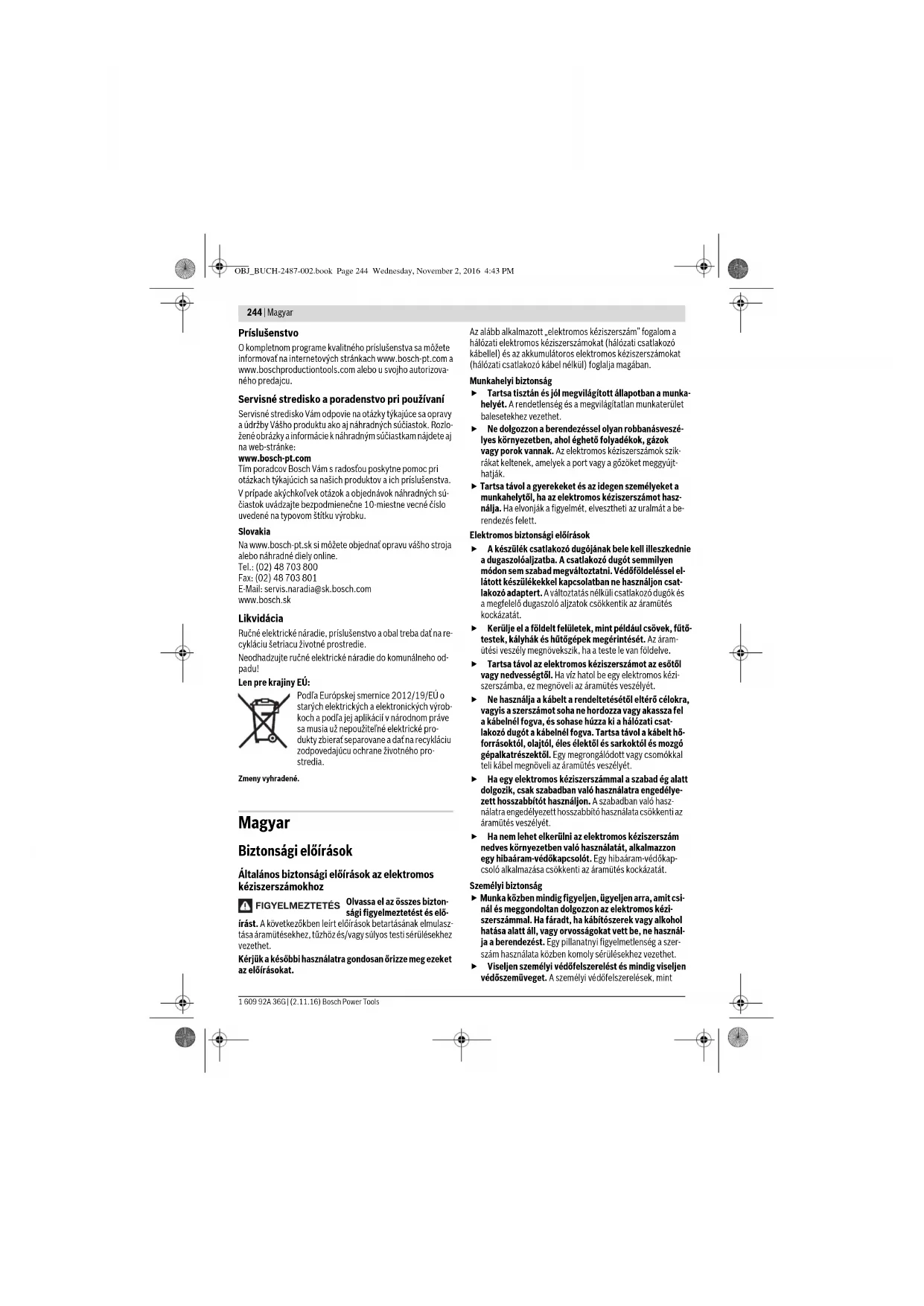 A pótfogantyún nem szabad változtatásokat végrehaj- tani. Ha egy pótfogantyú megrongálódott, ne használja to- vább. Kézvédő (lásd a „C” ábrát) A 17 gumi csiszolótányérral vagy a csészelakú kefé- vel/kefés tárcsával/legyezőlapos tárcsával végzett munkákhoz mindig fel kell szerelni a kézvédőt 9. –Rögzítse a 9 kézvédőt a 2 pótfogantyúval. Henk Becker Executive Vice President Engineering Helmut Heinzelmann Head of Product Certification PT/ECS A következő típusokra érvényes: – 0 602 304 40. – 0 602324 434 – 0 602324 44. – 0 602324 464 – 0 602324 474 – 0 602 329 5.. – 0 602 331 5.. – 0 602 332 5.. – 0 602 334 5.. A következő típusokra érvényes: – 0 602304 40. – 0 602324 434 – 0 602324 44. – 0 602324 464 – 0 602324 474 – 0 602 329 5.. – 0 602 331 5.. – 0 602 332 5.. – 0 602 334 5.. A következő típusokra érvényes: – 0 602 301 4.. – 0 602305 40. – 0 602306 434 – 0 602 324 40. OBJ_BUCH-2487-002.book Page 254 Wednesday, November 2, 2016 4:43 PM