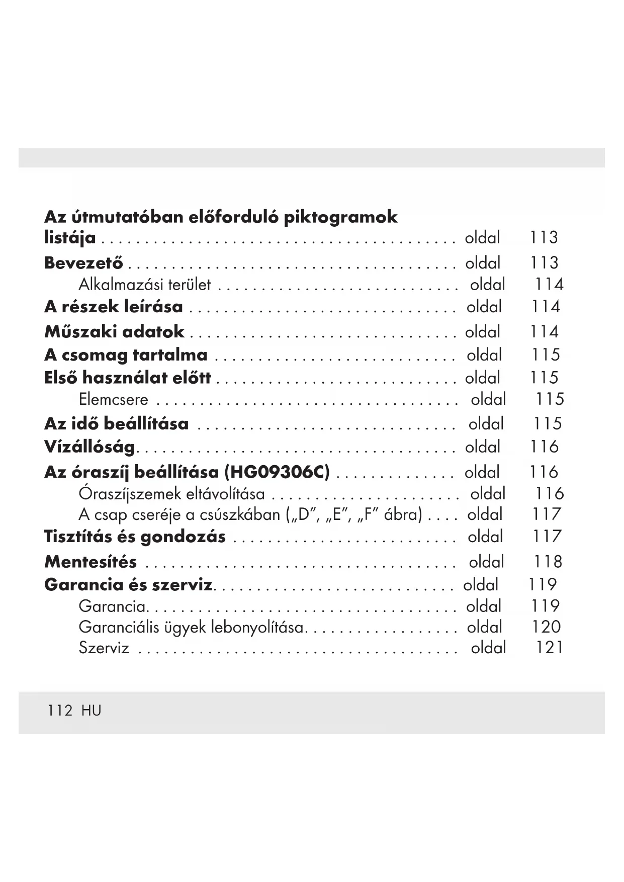 Alsó fedél (HG09306C)115 HU Műszaki adatok Elem: 1 x 1,5 V Gombelem (SR626SW típus) A csomag tartalma A kicsomagolást követően azonnal ellenőrizze a tételek hiánytalan meglétét, illetve a termék és alkatrészei épségét. 1 db. karóra 1 db. elem (beszerelve) 1 db. készlet használati útmutató 2 db. tartalék cserélhető szem (HG09306C) 1 db.javítókészlet (HG09306C) Első használat előtt Távolítsa el az összes csomagolóanyagot a termékről. Elemcsere Megjegyzés: Az elemeket szaküzletben cseréltesse ki.116 HU Az idő beállítása