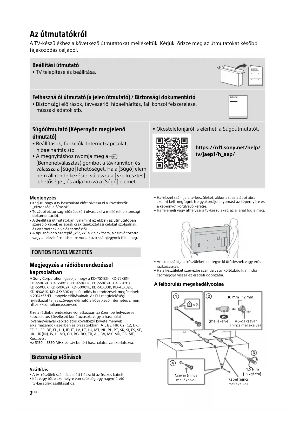 - Kérjük, hogy a tv használata előtt olvassa el a következőt: „Biztonsági előírások”.• További biztonsági előírásokért olvassa el a mellékelt biztonsági dokumentációt. • A Beállítási útmutatóban, valamint az ebben az útmutatóban szereplő képek és ábrák csak tájékoztatási célokat szolgálnak, és eltérhetnek a valós terméktől.• A típusnévben szereplő „x”/„xx” a kialakításra, a színváltozatra vagy a televízió-rendszerre vonatkozó számjegynek felel meg. Megjegyzés a rádióberendezéssel kapcsolatban A Sony Corporation igazolja, hogy a KD-75X82K, KD-75X81K, KD-65X82K, KD-65X81K, KD-65X80K, KD-55X82K, KD-55X81K, KD-55X80K, KD-50X82K, KD-50X81K, KD-50X80K, KD-43X82K, KD-43X81K, KD-43X80K típusú rádiós berendezések megfelelnek a 2014/53/EU irányelv előírásainak. Az EU-megfelelőségi nyilatkozat teljes szövege elérhető a következő internetes címen: https://compliance.sony.euErre a rádióberendezésre vonatkozóan az üzembe helyezéssel kapcsolatos következő korlátozások, vagy a használat jóváhagyásával kapcsolatos következő követelmények alkalmazandók ezekben az országokban: AT, BE, HR, CY, CZ, DK, EE, FI, FR, DE, EL, HU, IE, IT, LV, LT, LU, MT, NL, PL, PT, SK, SI, ES, SE, UK, UK (NI), IS, LI, NO, CH, BG, RO, TR, AL, BA, MK, MD, RS, ME, Koszovó :Az 5150 – 5350 MHz-es sáv beltéri használatra van korlátozva. Szállítás