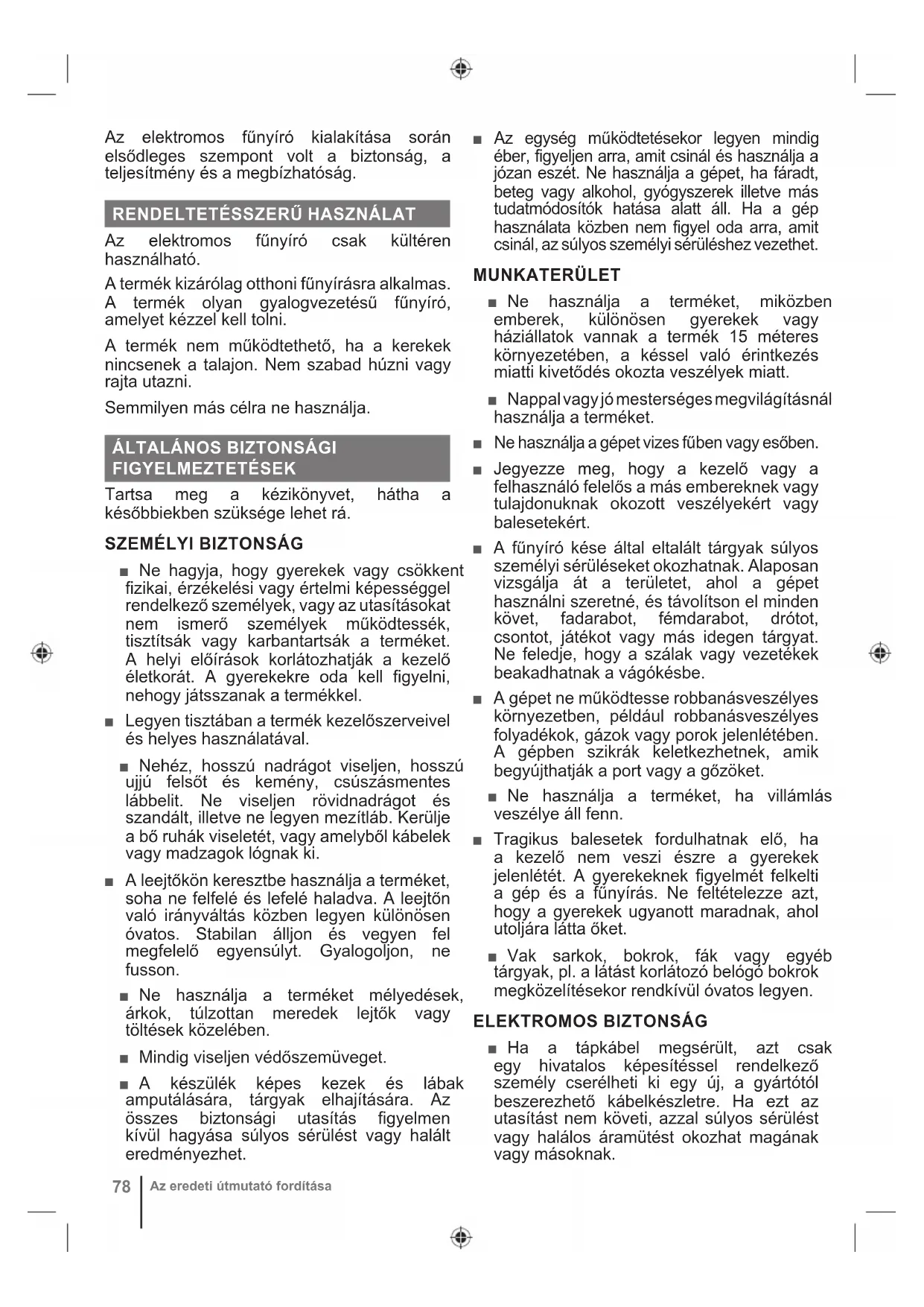 FIGYELMEZTETÉSEK ■ Használat előtt mindig szemrevételezze a munkagépet, hogy meggyőződjön arról, hogy a kések, a késeket rögzítő csavarok és a vágóegység nem kopottak vagy sérültek. Az egyensúly megtartása érdekében az elhasználódott vagy sérült késeket és csavarokat teljes készletben cserélje ki. ■ A sérült vagy olvashatatlan címkék cseréjéhez vigye vissza a terméket egy hivatalos szervizközpontba. ■ Ne húzza vissza a terméket, hacsak nem elkerülhetetlen. Ha vissza kell húznia a gépet egy faltól vagy akadálytól, először nézzen le és maga mögé, nehogy elessen vagy a lábaira húzza a gépet. ■ Kapcsolja ki a terméket és várja meg, amíg a penge leáll, ha a terméket szállítás során meg kell dönteni nem füves talajon való áthaladás során, és amikor a terméket munkaterületre szállítja, illetve onnan elviszi. ■ Soha ne használja a terméket hibás védőelemekkel vagy -lemezekkel, illetve úgy, hogy a biztonsági berendezések, például a terelők és/vagy fűgyűjtők nincsenek a helyükön. ■ Ne döntse meg a terméket, amikor bekapcsolja a motort, vagy amikor a motor jár. Szükség esetén a könnyebb indításhoz a fűnyíró eleje legfeljebb 5 cm magasra felemelhető. Ehhez nyomja le a tolókart. A vágás előtt minden esetben állítsa vissza a fűnyírót a normál helyzetébe, hogy mind a négy kereke a talajon legyen. A fűnyíró megbillentése szabaddá teszi a vágópengéket és növeli annak a veszélyét, hogy tárgyak repüljenek ki, illetve véletlenül hozzáérjen a vágópengékhez. ■ Ne indítsa el a készüléket, ha a nyitott fűkidobónyílás előtt áll. ■ A terméket csak úgy szabad beindítani, hogy a kezelő a fogantyú mögött, a biztonságos zónában tartózkodik. Ne indítsa be a terméket, ha:80 Az eredeti útmutató fordítása ● a fűkidobó csúszda kint van, és nem védi a fűdoboz és a fűkidobó csúszda fedele ● a gép körül álló személyek keze és lába nincs távol a vágókések burkolatától ■ A terméket óvatosan és az előírások szerint kapcsolja be, és tartsa távol a kezét és a lábát a vágópengéktől. Ne helyezze kezét vagy lábát a forgó részek alá vagy közelébe. A kiürítő nyílás legyen mindig akadálymentes. ■ Ne emelje fel és ne szállítsa a terméket működő motorral. ■ Kapcsolja ki a terméket, és húzza ki a csatlakozót a hálózatból. Ellenőrizze, hogy minden mozgó rész teljesen megállt: ● amikor felügyelet nélkül hagyja a gépet (beleértve a levágott fű kidobását is). ● egy eltömődés vagy az eldugult ürítőcsúszda tisztítása előtt ● ellenőrzés, karbantartás vagy a gépen végzett bármilyen művelet megkezdése előtt; ● mielőtt leszereli a fűgyűjtőt, illetve kinyitja a fűürítő csúszda fedelét ● idegen tárgyak eltalálása után; a gép újraindítása és működtetése előtt vizsgálja meg a gépet sérülések tekintetében, és szükség esetén végezze el a javításokat; ● Ha a termék erőteljesen rázkódni kezd, haladéktalanul: – a sérülések, különösen a kések vizsgálatakor – cserélje ki vagy javítsa meg a sérült alkatrészeket – ellenőrizze és húzza meg a meglazult alkatrészeket ■ A vágókésnek nagyjából párhuzamosan kell forognia a talajfelszínnel, amelyen tolja a fűnyírót. ■ A termékre szerelt kés éles. Óvatosan járjon el, és viseljen nehéz igénybevételre tervezett kesztyűt a felszerelésükkor, cseréjükkor, tisztításukkor vagy a csavarok ellenőrzésekor. ■ Ne működtesse a terméket, ha a markolaton található be/ki kapcsoló nem megfelelően indítja és állítja le a terméket. ■ Ne próbálja meg rögzíteni a be/ki kapcsolókat BE állásba; ez különösen veszélyes. ■ Ne erőltesse a terméket. A gép jobban teljesít és biztonságosabban dolgozik olyan sebesség használatakor, amilyenre azt tervezték. ■ Kavicsos felületeken való áthaladáskor állítsa le a fűnyírót. ■ Kerülje a lyukakat, keréknyomokat, köveket és más rejtett tárgyakat. Az egyenetlen talaj csúszási vagy esési balesetet okozhat. ■ Mindig figyeljen oda arra, hogy a motor vezérlőkábele ne akadjon be, ne csípődjön be és máshogy se károsodjon a kar összeszerelésekor vagy lehajtásakor. Soha ne helyezze feszültség alá a terméket, ha a kábel megrongálódott. A terméket csak engedéllyel rendelkező szervizben javíttassa. ■ Injuries may be caused, or aggravated, by prolonged use of a tool. Ha a terméket hosszabb ideig használja, ügyeljen arra, hogy rendszeresen tartson szünetet.