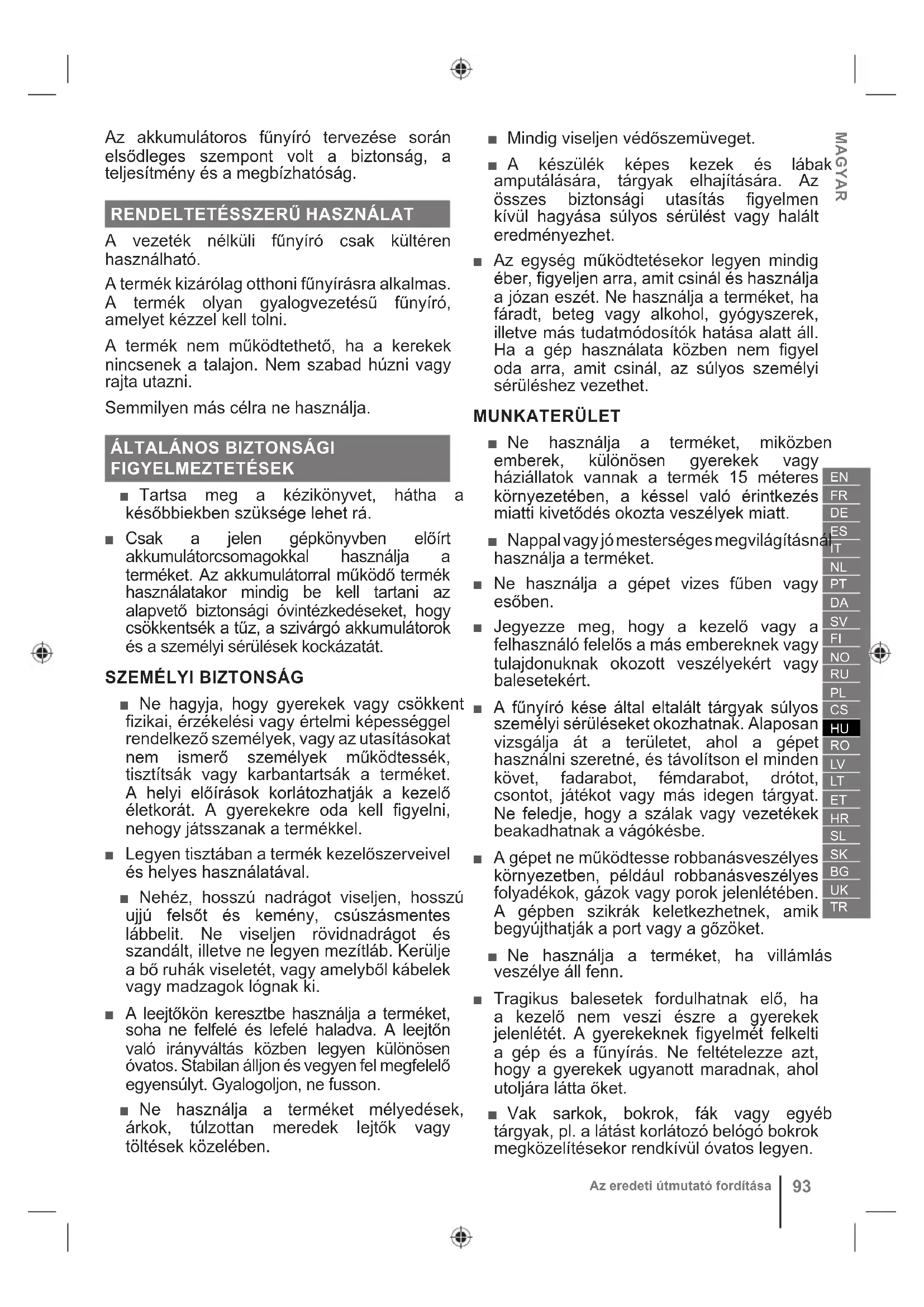 ■ Ne hagyja, hogy gyerekek vagy csökkent fizikai, érzékelési vagy értelmi képességgel rendelkező személyek, vagy az utasításokat nem ismerő személyek működtessék, tisztítsák vagy karbantartsák a terméket. A helyi előírások korlátozhatják a kezelő életkorát. A gyerekekre oda kell figyelni, nehogy játsszanak a termékkel. ■ Legyen tisztában a termék kezelőszerveivel és helyes használatával. ■ Nehéz, hosszú nadrágot viseljen, hosszú ujjú felsőt és kemény, csúszásmentes lábbelit. Ne viseljen rövidnadrágot és szandált, illetve ne legyen mezítláb. Kerülje a bő ruhák viseletét, vagy amelyből kábelek vagy madzagok lógnak ki. ■ A leejtőkön keresztbe használja a terméket, soha ne felfelé és lefelé haladva. A leejtőn való irányváltás közben legyen különösen óvatos. Stabilan álljon és vegyen fel megfelelő egyensúlyt. Gyalogoljon, ne fusson. ■ Ne használja a terméket mélyedések, árkok, túlzottan meredek lejtők vagy töltések közelében. ■ Mindig viseljen védőszemüveget. ■ A készülék képes kezek és lábak amputálására, tárgyak elhajítására. Az összes biztonsági utasítás figyelmen kívül hagyása súlyos sérülést vagy halált eredményezhet. ■ Az egység működtetésekor legyen mindig éber, figyeljen arra, amit csinál és használja a józan eszét. Ne használja a terméket, ha fáradt, beteg vagy alkohol, gyógyszerek, illetve más tudatmódosítók hatása alatt áll. Ha a gép használata közben nem figyel oda arra, amit csinál, az súlyos személyi sérüléshez vezethet. MUNKATERÜLET ■ Ne használja a terméket, miközben emberek, különösen gyerekek vagy háziállatok vannak a termék 15 méteres környezetében, a késsel való érintkezés miatti kivetődés okozta veszélyek miatt. ■ Nappal vagy jó mesterséges megvilágításnál használja a terméket. ■ Ne használja a gépet vizes fűben vagy esőben. ■ Jegyezze meg, hogy a kezelő vagy a felhasználó felelős a más embereknek vagy tulajdonuknak okozott veszélyekért vagy balesetekért. ■ A fűnyíró kése által eltalált tárgyak súlyos személyi sérüléseket okozhatnak. Alaposan vizsgálja át a területet, ahol a gépet használni szeretné, és távolítson el minden követ, fadarabot, fémdarabot, drótot, csontot, játékot vagy más idegen tárgyat. Ne feledje, hogy a szálak vagy vezetékek beakadhatnak a vágókésbe. ■ A gépet ne működtesse robbanásveszélyes környezetben, például robbanásveszélyes folyadékok, gázok vagy porok jelenlétében. A gépben szikrák keletkezhetnek, amik begyújthatják a port vagy a gőzöket. ■ Ne használja a terméket, ha villámlás veszélye áll fenn. ■ Tragikus balesetek fordulhatnak elő, ha a kezelő nem veszi észre a gyerekek jelenlétét. A gyerekeknek figyelmét felkelti a gép és a fűnyírás. Ne feltételezze azt, hogy a gyerekek ugyanott maradnak, ahol utoljára látta őket. ■ Vak sarkok, bokrok, fák vagy egyéb tárgyak, pl. a látást korlátozó belógó bokrok megközelítésekor rendkívül óvatos legyen.94 Az eredeti útmutató fordítása