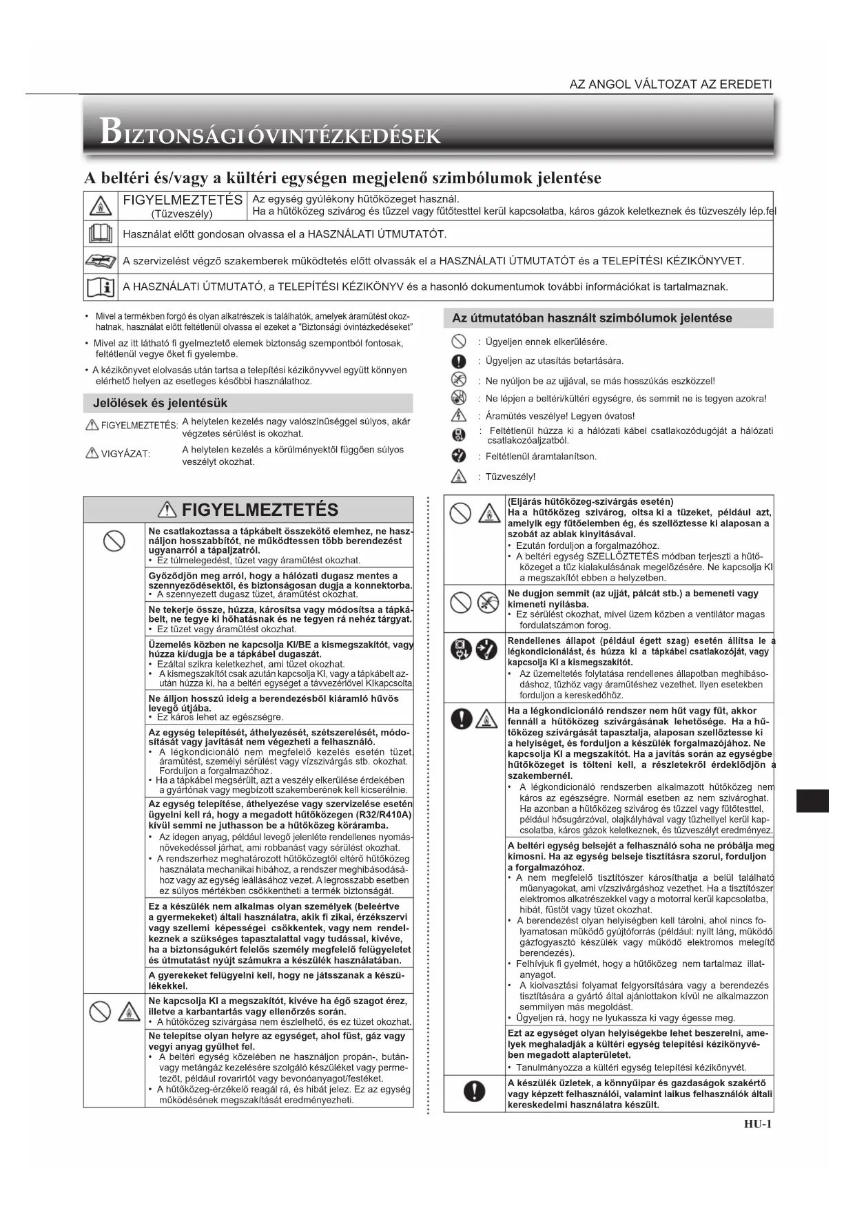 - Mivel az itt látható fi gyelmeztető elemek biztonság szempontból fontosak, feltétlenül vegye őket fi gyelembe.• A kézikönyvet elolvasás után tartsa a telepítési kézikönyvvel együtt könnyen elérhető helyen az esetleges későbbi használathoz. Jelölések és jelentésük FIGYELMEZTETÉS:A helytelen kezelés nagy valószínűséggel súlyos, akár végzetes sérülést is okozhat. VIGYÁZAT:A helytelen kezelés a körülményektől függően súlyos veszélyt okozhat. (Eljárás hűtőközeg-szivárgás esetén)Ha a hűtőközeg szivárog, oltsa ki a tüzeket, például azt, amelyik egy fűtőelemben ég, és szellőztesse ki alaposan a szobát az ablak kinyitásával.• Ezután forduljon a forgalmazóhoz.• A beltéri egység SZELLŐZTETÉS módban terjeszti a hűtő-közeget a tűz kialakulásának megelőzésére. Ne kapcsolja KI a megszakítót ebben a helyzetben. Ne dugjon semmit (az ujját, pálcát stb.) a bemeneti vagy kimeneti nyílásba.• Ez sérülést okozhat, mivel üzem közben a ventilátor magas fordulatszámon forog. Rendellenes állapot (például égett szag) esetén állítsa le a légkondicionálást, és húzza ki a tápkábel csatlakozóját, vagy kapcsolja KI a kismegszakítót