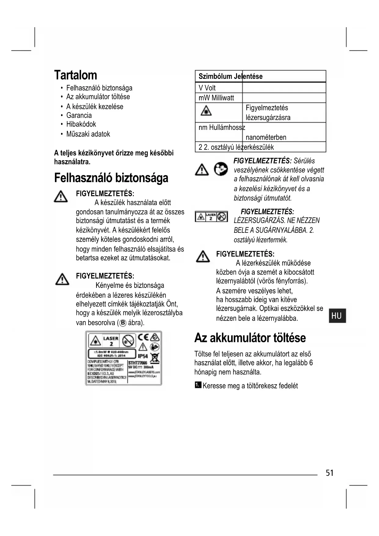 ábra). Szimbólum Jelentése V Volt mW Milliwatt Figyelmeztetés lézersugárzásra nm Hullámhossz nanométerben 2 2. osztályú lézerkészülék FIGYELMEZTETÉS: Sérülés veszélyének csökkentése végett a felhasználónak át kell olvasnia a kezelési kézikönyvet és a biztonsági útmutatót. FIGYELMEZTETÉS: LÉZERSUGÁRZÁS. NE NÉZZEN BELE A SUGÁRNYALÁBBA. 2. osztályú lézertermék. FIGYELMEZTETÉS: A lézerkészülék működése közben óvja a szemét a kibocsátott lézernyalábtól (vörös fényforrás). A szemére veszélyes lehet, ha hosszabb ideig van kitéve lézersugárnak. Optikai eszközökkel se nézzen bele a lézernyalábba. Az akkumulátor töltése Töltse fel teljesen az akkumulátort az első használat előtt, illetve akkor, ha legalább 6 hónapig nem használta.