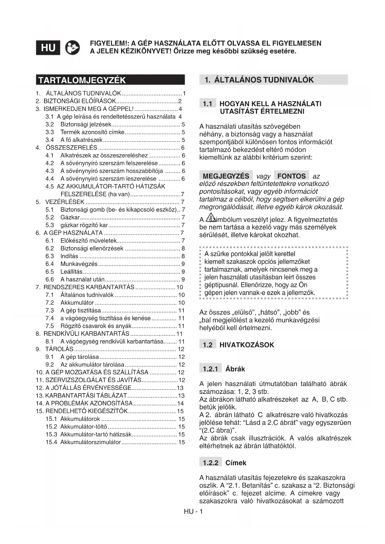 A használati utasítás fejezetekre és szakaszokra oszlik. A “2.1. Betanítás” c. szakasz a “2. Biztonsági előírások” c. fejezet alcíme. A címekre vagy szakaszokra való hivatkozásokat a számozott TARTALOMJEGYZÉK
