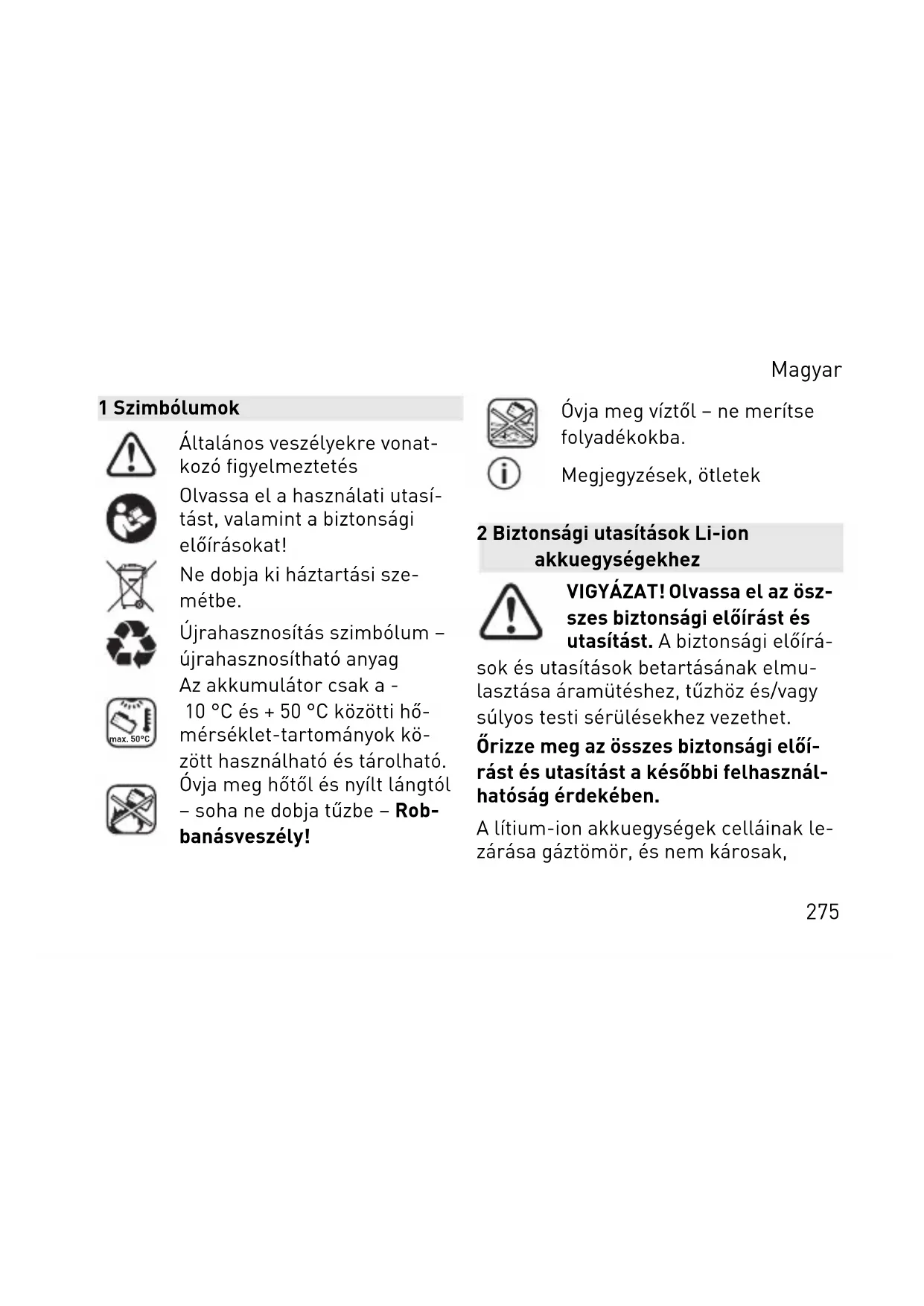 megfelelő használatához Az akkuegységet félig feltöltve szállítjuk. A teljes teljesítmény biztosítása érdekében első hasz nálat előtt teljesen töltse fel az akkuegységet a töltőkészülék ben. Magyar 280Az akkuegység bármikor feltölthető anélkül, hogy csökkenne az élettarta ma. A töltési folyamat megszakítása nem károsítja az akkuegységet. Az elektromos kéziszerszám automatikus kikapcsolása után ne nyomja meg a ki-/ bekapcsoló gombot. Az akkuegység ká rosodhat. Az akkuegység hőmérséklet-felügyelet tel van ellátva, mely a feltöltést csak 0 °C és 55 °C közötti hőmérséklet-tarto mányban engedélyezi. Ezáltal magas akkuélettartam érhető el. – Az akkuegységeket lehetőleg hűvös (5 °C és 25 °C között) és száraz (levegő páratartalma < 80%) helyen tárolja. – Az akkuegységet pl. nyáron ne felejtse az autóban. – Ha a feltöltéseket követő üzemidő je lentősen lerövidül, az azt jelenti, hogy az akkuegység elhasználódott, és ki kell cserélni. – Ügyeljen az ártalmatlanítási tudniva lók betartására.
