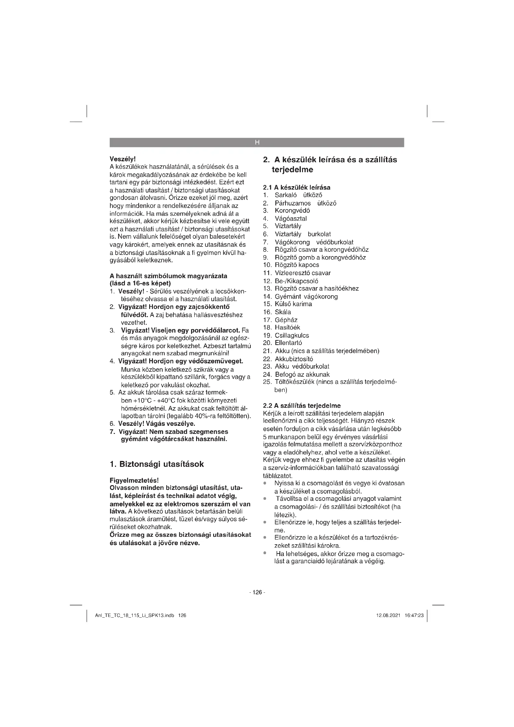 A szükséges zajcsökkentő füllvédő használa- tának mellőzésekor a hallás károdása. Kérjük vegye fi gyelembe, hogy a készülékeink a meghatározásuk szerint nem kisipari, kézműipari vagy ipari üzemek területén történő bevetésre lettek tervezve. Ezért a nem vállalunk szavatossá- got, ha a készülék kisipari, kézműipari vagy ipari üzemek területén valamint egyenértékű tevéke- nységek területén van használva. Anl_TE_TC_18_115_Li_SPK13.indb 128Anl_TE_TC_18_115_Li_SPK13.indb 128 12.08.2021 16:47:2312.08.2021 16:47:23H