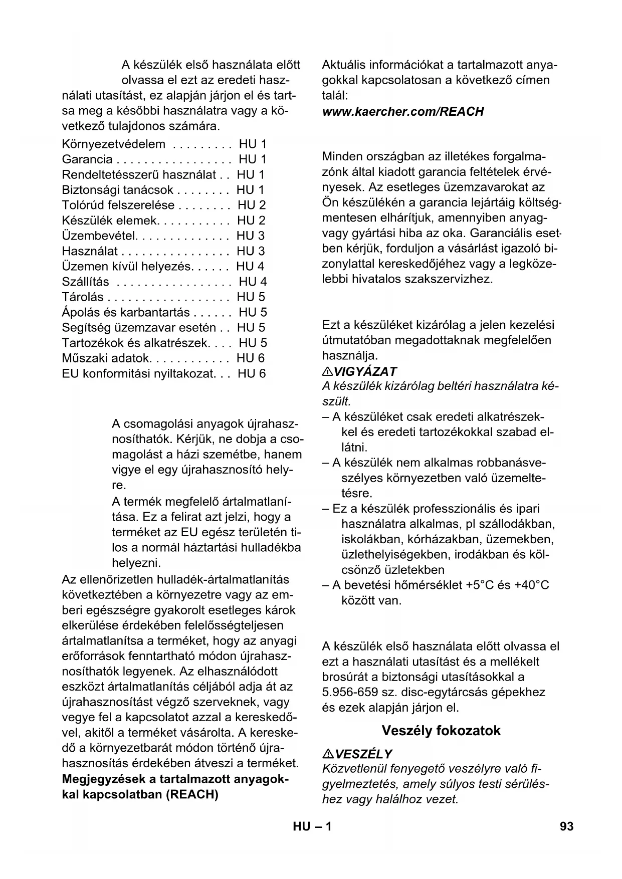 Chairman of the Board of Management Director Regulatory Affairs & Certification 92 RU– 1 A készülék első használata előtt olvassa el ezt az eredeti hasz- nálati utasítást, ez alapján járjon el és tart- sa meg a későbbi használatra vagy a kö- vetkező tulajdonos számára. Az ellenőrizetlen hulladék-ártalmatlanítás következtében a környezetre vagy az em- beri egészségre gyakorolt esetleges károk elkerülése érdekében felelősségteljesen ártalmatlanítsa a terméket, hogy az anyagi erőforrások fenntartható módon újrahasz- nosíthatók legyenek. Az elhasználódott eszközt ártalmatlanítás céljából adja át az újrahasznosítást végző szerveknek, vagy vegye fel a kapcsolatot azzal a kereskedő- vel, akitől a terméket vásárolta. A kereske- dő a környezetbarát módon történő újra- hasznosítás érdekében átveszi a terméket. Megjegyzések a tartalmazott anyagok- kal kapcsolatban (REACH) Aktuális információkat a tartalmazott anya- gokkal kapcsolatosan a következő címen talál: www.kaercher.com/REACH Minden országban az illetékes forgalma- zónk által kiadott garancia feltételek érvé- nyesek. Az esetleges üzemzavarokat az Ön készülékén a garancia lejártáig költség- mentesen elhárítjuk, amennyiben anyag- vagy gyártási hiba az oka. Garanciális eset- ben kérjük, forduljon a vásárlást igazoló bi- zonylattal kereskedőjéhez vagy a legköze- lebbi hivatalos szakszervizhez. Ezt a készüléket kizárólag a jelen kezelési útmutatóban megadottaknak megfelelően használja. 몇 VIGYÁZAT A készülék kizárólag beltéri használatra ké- szült. – A készüléket csak eredeti alkatrészek- kel és eredeti tartozékokkal szabad el- látni. – A készülék nem alkalmas robbanásve- szélyes környezetben való üzemelte- tésre. – Ez a készülék professzionális és ipari használatra alkalmas, pl szállodákban, iskolákban, kórházakban, üzemekben, üzlethelyiségekben, irodákban és köl- csönző üzletekben – A bevetési hőmérséklet +5°C és +40°C között van. A készülék első használata előtt olvassa el ezt a használati utasítást és a mellékelt brosúrát a biztonsági utasításokkal a 5.956-659 sz. disc-egytárcsás gépekhez és ezek alapján járjon el. VESZÉLY Közvetlenül fenyegető veszélyre való fi- gyelmeztetés, amely súlyos testi sérülés- hez vagy halálhoz vezet. Környezetvédelem . . . . . . . . . HU 1 Garancia . . . . . . . . . . . . . . . . . HU 1 Rendeltetésszerű használat . . HU 1 Biztonsági tanácsok . . . . . . . . HU 1 Tolórúd felszerelése . . . . . . . . HU 2 Készülék elemek. . . . . . . . . . . HU 2 Üzembevétel. . . . . . . . . . . . . . HU 3 Használat . . . . . . . . . . . . . . . . HU 3 Üzemen kívül helyezés. . . . . . HU 4 Szállítás . . . . . . . . . . . . . . . . . HU 4 Tárolás . . . . . . . . . . . . . . . . . . HU 5 Ápolás és karbantartás . . . . . . HU 5 Segítség üzemzavar esetén . . HU 5 Tartozékok és alkatrészek. . . . HU 5 Műszaki adatok. . . . . . . . . . . . HU 6 EU konformitási nyiltakozat. . . HU 6 Környezetvédelem A csomagolási anyagok újrahasz- nosíthatók. Kérjük, ne dobja a cso- magolást a házi szemétbe, hanem vigye el egy újrahasznosító hely- re. A termék megfelelő ártalmatlaní- tása. Ez a felirat azt jelzi, hogy a terméket az EU egész területén ti- los a normál háztartási hulladékba helyezni. Garancia Rendeltetésszerű használat Biztonsági tanácsok Veszély fokozatok 93HU– 2 몇 FIGYELMEZTETÉS Lehetséges veszélyes helyzetre való fi- gyelmeztetés, amely súlyos testi sérülés- hez vagy halálhoz vezethet. 몇 VIGYÁZAT Figyelmeztetés esetlegesen veszélyes helyzetre, amely könnyű sérüléshez vezet- het. FIGYELEM Lehetséges veszélyes helyzetre való fi- gyelmeztetés, amely anyagi kárhoz vezet- het. A biztonsági berendezések a felhasználó védelmét szolgálják, ezért ezeket nem sza- bad üzemen kívül helyezni vagy a működé- sükbe beleavatkozni. Megakadályozza a készülék véletlen be- kapcsolását. A készülék bekapcsolásához nyomja meg a reteszelés feloldó billentyűt, majd az BE / KI kapcsolót. Üzembevétel előtt a tolórudat az ábrán lát- ható módon kell felszerelni, és létre kell hozni az elektromos összeköttetést a ké- szülékhez. Az ábrát lásd a borító oldalon A készülékábrán a BDS 43/150 C Classic készülék látható. A BDS 43/Duo C készü- lék ettől kissé eltér. 1 Menesztő, tárcsakefe / párna hajtótá- nyér 2 Kefe/párna hajtótányér 3 Adagolókar tisztítószer oldat (opcioná- lis) 4 BE / KI kapcsoló 5 Kábel tartó 6 Kibiztosító gomb 7 Markolat 8 Kar dőlésszög elállítás 9 Kefe meghajtás biztosíték 10 Dugalj a tartozék számára 11 Tisztítószer tartály (opcionális) 12 Készülékház 13 Kefe fordulatszám kapcsoló (csak BDS 43/Duo C-hez) ** nem része a szállítási tételnek Biztonsági berendezések Zár Tolórúd felszerelése Készülék elemek