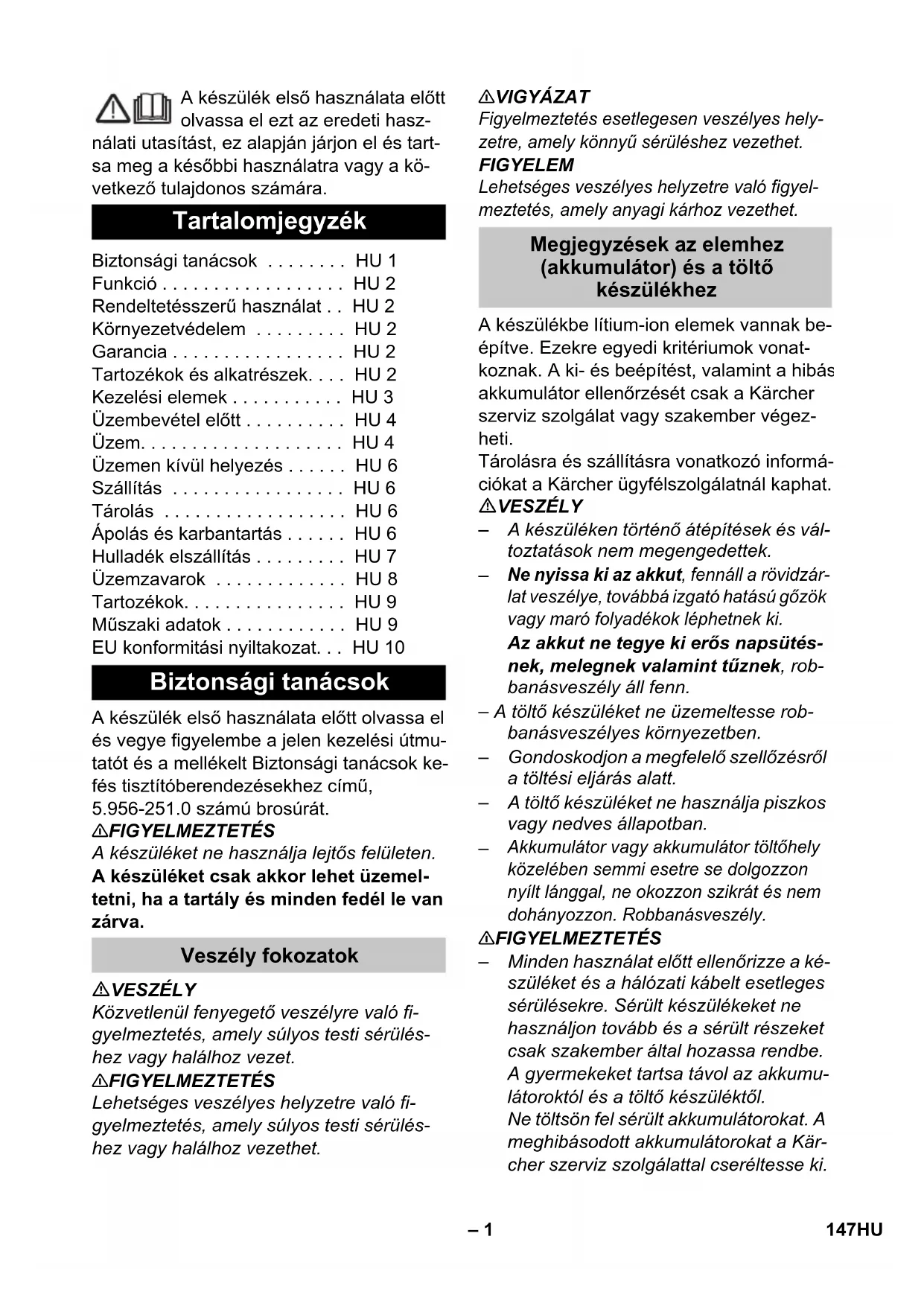 Akkumulátor vagy akkumulátor töltőhely közelében semmi esetre se dolgozzon nyílt lánggal, ne okozzon szikrát és nem dohányozzon. Robbanásveszély. 몇 FIGYELMEZTETÉS – Minden használat előtt ellenőrizze a ké- szüléket és a hálózati kábelt esetleges sérülésekre. Sérült készülékeket ne használjon tovább és a sérült részeket csak szakember által hozassa rendbe. A gyermekeket tartsa távol az akkumu- látoroktól és a töltő készüléktől. Ne töltsön fel sérült akkumulátorokat. A meghibásodott akkumulátorokat a Kär- cher szerviz szolgálattal cseréltesse ki. Tartalomjegyzék Biztonsági tanácsok . . . . . . . . HU 1 Funkció . . . . . . . . . . . . . . . . . . HU 2 Rendeltetésszerű használat . . HU 2 Környezetvédelem . . . . . . . . . HU 2 Garancia . . . . . . . . . . . . . . . . . HU 2 Tartozékok és alkatrészek. . . . HU 2 Kezelési elemek . . . . . . . . . . . HU 3 Üzembevétel előtt . . . . . . . . . . HU 4 Üzem. . . . . . . . . . . . . . . . . . . . HU 4 Üzemen kívül helyezés . . . . . . HU 6 Szállítás . . . . . . . . . . . . . . . . . HU 6 Tárolás . . . . . . . . . . . . . . . . . . HU 6 Ápolás és karbantartás . . . . . . HU 6 Hulladék elszállítás . . . . . . . . . HU 7 Üzemzavarok . . . . . . . . . . . . . HU 8 Tartozékok. . . . . . . . . . . . . . . . HU 9 Műszaki adatok . . . . . . . . . . . . HU 9 EU konformitási nyiltakozat. . . HU 10 Biztonsági tanácsok Veszély fokozatok Megjegyzések az elemhez (akkumulátor) és a töltő készülékhez 147HU– 2