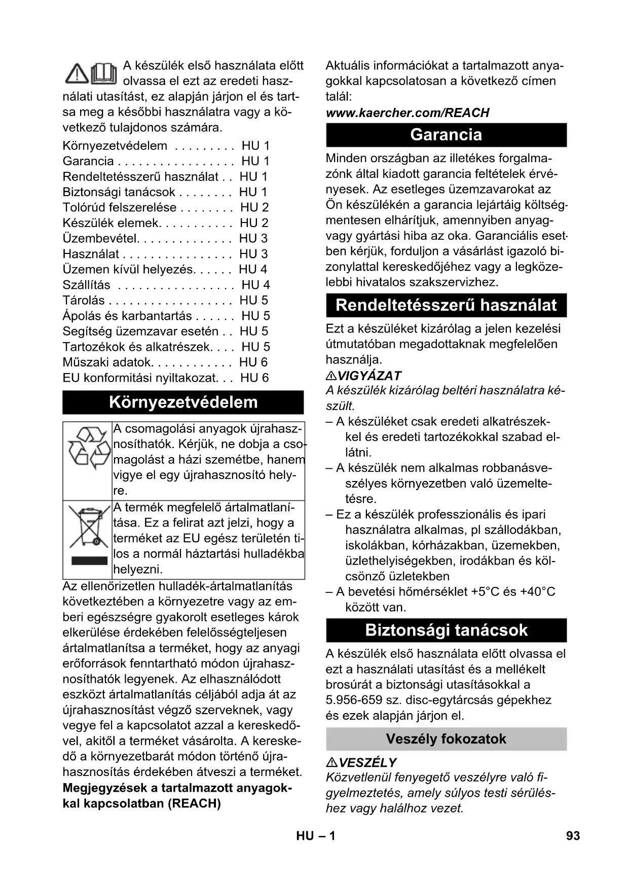Chairman of the Board of Management Director Regulatory Affairs & Certification 92 RU– 1 A készülék első használata előtt olvassa el ezt az eredeti hasz- nálati utasítást, ez alapján járjon el és tart- sa meg a későbbi használatra vagy a kö- vetkező tulajdonos számára. Az ellenőrizetlen hulladék-ártalmatlanítás következtében a környezetre vagy az em- beri egészségre gyakorolt esetleges károk elkerülése érdekében felelősségteljesen ártalmatlanítsa a terméket, hogy az anyagi erőforrások fenntartható módon újrahasz- nosíthatók legyenek. Az elhasználódott eszközt ártalmatlanítás céljából adja át az újrahasznosítást végző szerveknek, vagy vegye fel a kapcsolatot azzal a kereskedő- vel, akitől a terméket vásárolta. A kereske- dő a környezetbarát módon történő újra- hasznosítás érdekében átveszi a terméket. Megjegyzések a tartalmazott anyagok- kal kapcsolatban (REACH) Aktuális információkat a tartalmazott anya- gokkal kapcsolatosan a következő címen talál: www.kaercher.com/REACH Minden országban az illetékes forgalma- zónk által kiadott garancia feltételek érvé- nyesek. Az esetleges üzemzavarokat az Ön készülékén a garancia lejártáig költség- mentesen elhárítjuk, amennyiben anyag- vagy gyártási hiba az oka. Garanciális eset- ben kérjük, forduljon a vásárlást igazoló bi- zonylattal kereskedőjéhez vagy a legköze- lebbi hivatalos szakszervizhez. Ezt a készüléket kizárólag a jelen kezelési útmutatóban megadottaknak megfelelően használja. 몇 VIGYÁZAT A készülék kizárólag beltéri használatra ké- szült. – A készüléket csak eredeti alkatrészek- kel és eredeti tartozékokkal szabad el- látni. – A készülék nem alkalmas robbanásve- szélyes környezetben való üzemelte- tésre. – Ez a készülék professzionális és ipari használatra alkalmas, pl szállodákban, iskolákban, kórházakban, üzemekben, üzlethelyiségekben, irodákban és köl- csönző üzletekben – A bevetési hőmérséklet +5°C és +40°C között van. A készülék első használata előtt olvassa el ezt a használati utasítást és a mellékelt brosúrát a biztonsági utasításokkal a 5.956-659 sz. disc-egytárcsás gépekhez és ezek alapján járjon el. VESZÉLY Közvetlenül fenyegető veszélyre való fi- gyelmeztetés, amely súlyos testi sérülés- hez vagy halálhoz vezet. Környezetvédelem . . . . . . . . . HU 1 Garancia . . . . . . . . . . . . . . . . . HU 1 Rendeltetésszerű használat . . HU 1 Biztonsági tanácsok . . . . . . . . HU 1 Tolórúd felszerelése . . . . . . . . HU 2 Készülék elemek. . . . . . . . . . . HU 2 Üzembevétel. . . . . . . . . . . . . . HU 3 Használat . . . . . . . . . . . . . . . . HU 3 Üzemen kívül helyezés. . . . . . HU 4 Szállítás . . . . . . . . . . . . . . . . . HU 4 Tárolás . . . . . . . . . . . . . . . . . . HU 5 Ápolás és karbantartás . . . . . . HU 5 Segítség üzemzavar esetén . . HU 5 Tartozékok és alkatrészek. . . . HU 5 Műszaki adatok. . . . . . . . . . . . HU 6 EU konformitási nyiltakozat. . . HU 6 Környezetvédelem A csomagolási anyagok újrahasz- nosíthatók. Kérjük, ne dobja a cso- magolást a házi szemétbe, hanem vigye el egy újrahasznosító hely- re. A termék megfelelő ártalmatlaní- tása. Ez a felirat azt jelzi, hogy a terméket az EU egész területén ti- los a normál háztartási hulladékba helyezni. Garancia Rendeltetésszerű használat Biztonsági tanácsok Veszély fokozatok 93HU– 2 몇 FIGYELMEZTETÉS Lehetséges veszélyes helyzetre való fi- gyelmeztetés, amely súlyos testi sérülés- hez vagy halálhoz vezethet. 몇 VIGYÁZAT Figyelmeztetés esetlegesen veszélyes helyzetre, amely könnyű sérüléshez vezet- het. FIGYELEM Lehetséges veszélyes helyzetre való fi- gyelmeztetés, amely anyagi kárhoz vezet- het. A biztonsági berendezések a felhasználó védelmét szolgálják, ezért ezeket nem sza- bad üzemen kívül helyezni vagy a működé- sükbe beleavatkozni. Megakadályozza a készülék véletlen be- kapcsolását. A készülék bekapcsolásához nyomja meg a reteszelés feloldó billentyűt, majd az BE / KI kapcsolót. Üzembevétel előtt a tolórudat az ábrán lát- ható módon kell felszerelni, és létre kell hozni az elektromos összeköttetést a ké- szülékhez. Az ábrát lásd a borító oldalon A készülékábrán a BDS 43/150 C Classic készülék látható. A BDS 43/Duo C készü- lék ettől kissé eltér. 1 Menesztő, tárcsakefe / párna hajtótá- nyér 2 Kefe/párna hajtótányér 3 Adagolókar tisztítószer oldat (opcioná- lis) 4 BE / KI kapcsoló 5 Kábel tartó 6 Kibiztosító gomb 7 Markolat 8 Kar dőlésszög elállítás 9 Kefe meghajtás biztosíték 10 Dugalj a tartozék számára 11 Tisztítószer tartály (opcionális) 12 Készülékház 13 Kefe fordulatszám kapcsoló (csak BDS 43/Duo C-hez) ** nem része a szállítási tételnek Biztonsági berendezések Zár Tolórúd felszerelése Készülék elemek