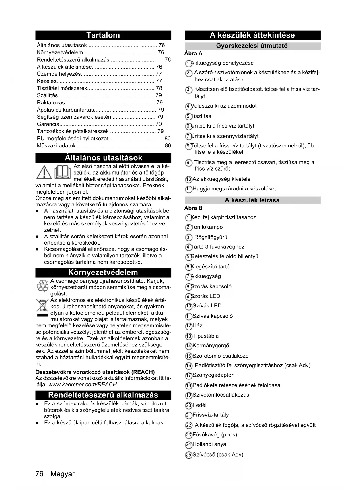- 0,276 Magyar Tartalom Általános utasítások Az első használat előtt olvassa el a ké- szülék, az akkumulátor és a töltőgép mellékelt eredeti használati utasítását, valamint a mellékelt biztonsági tanácsokat. Ezeknek megfelelően járjon el. Őrizze meg az említett dokumentumokat későbbi alkal- mazásra vagy a következő tulajdonos számára. ● A használati utasítás és a biztonsági utasítások be nem tartása a készülék károsodásához, valamint a kezelő és más személyek veszélyeztetéséhez ve- zethet. ● A szállítás során keletkezett károk esetén azonnal értesítse a kereskedőt. ● Kicsomagolásnál ellenőrizze, hogy a csomagolás- ból nem hiányzik-e valamilyen tartozék, illetve a csomagolás tartalma nem károsodott-e. Környezetvédelem A csomagolóanyag újrahasznosítható. Kérjük, környezetbarát módon semmisítse meg a csoma- golást. Az elektromos és elektronikus készülékek érté- kes, újrahasznosítható anyagokat, és gyakran olyan alkotóelemeket, például elemeket, akku- mulátorokat vagy olajat is tartalmaznak, melyek nem megfelelő kezelése vagy helytelen megsemmisíté- se potenciális veszélyt jelenthet az emberek egészség- re és a környezetre. Ezek az alkotóelemek azonban a készülék rendeltetésszerű üzemeléséhez szüksége- sek. Az ezzel a szimbólummal jelölt készülékeket nem szabad a háztartási hulladékkal együtt megsemmisíte- ni. Összetevőkre vonatkozó utasítások (REACH) Az összetevőkre vonatkozó aktuális információkat itt ta- lálja: www.kaercher.com/REACH Rendeltetésszerű alkalmazás ● Ez a szóróextrakciós készülék párnák, kárpitozott bútorok és kis szőnyegfelületek nedves tisztítására szolgál. ● Ez a készülék ipari célú felhasználásra alkalmas. A készülék áttekintése Gyorskezelési útmutató Ábra A 1 Akkuegység behelyezése 2 A szóró-/ szívótömlőnek a készülékhez és a kézifej- hez csatlakoztatása 3 Készítsen elő tisztítóoldatot, töltse fel a friss víz tar- tályt 4 Válassza ki az üzemmódot 5 Tisztítás 6 Ürítse ki a friss víz tartályt 7 Ürítse ki a szennyvíztartályt 8 Töltse fel a friss víz tartályt (tisztítószer nélkül), öb- lítse le a készüléket 9 Tisztítsa meg a leeresztő csavart, tisztítsa meg a friss víz szűrőt 10 Az akkuegység kivétele 11 Hagyja megszáradni a készüléket A készülék leírása Ábra B 1 Kézi fej kárpit tisztításához 2 Tömlőkampó 3 Rögzítőgyűrű 4 Tartó 3 fúvókavéghez 5 Reteszelés feloldó billentyű 6 Kiegészítő-tartó 7 Akkuegység 8 Szórás kapcsoló 9 Szórás LED 10 Szívás LED 11 Szívás kapcsoló 12 Ház 13 Típustábla 14 Kormánygörgő 15 Szórótömlő-csatlakozó 16 Padlótisztító fej szőnyegtisztításhoz (csak Adv) 17 Szőnyegadapter 18 Padlókefe reteszelésének feloldása 19 Szívótömlőcsatlakozás 20 Fedél 21 Frissvíz-tartály 22 A készülék fogója, a szívócső rögzítésével együtt 23 Fúvókavég (piros) 24 Hollandi anya 25 Szívócső (csak Adv) Általános utasítások p. 76