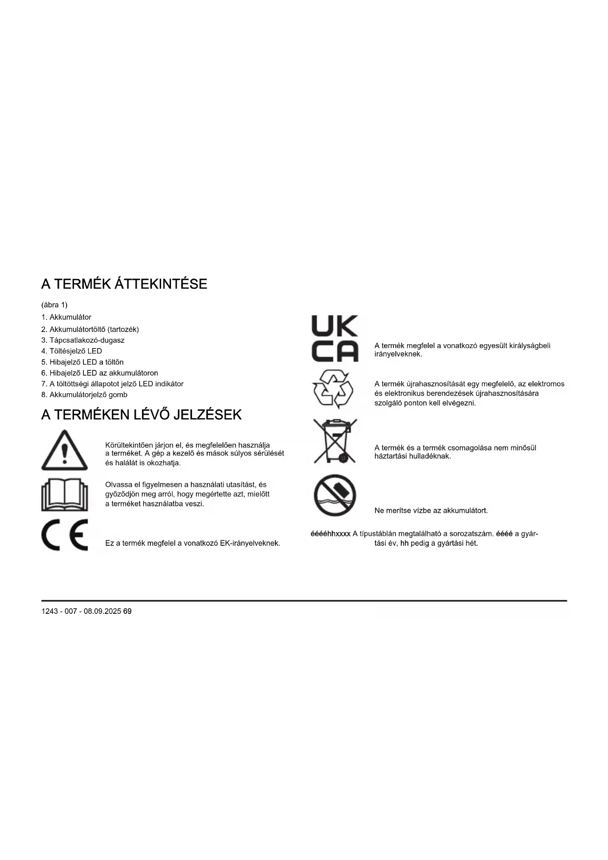 A TERMÉKEN LÉVŐ JELZÉSEK Körültekintően járjon el, és megfelelően használja a terméket. A gép a kezelő és mások súlyos sérülését és halálát is okozhatja. Olvassa el figyelmesen a használati utasítást, és győződjön meg arról, hogy megértette azt, mielőtt a terméket használatba veszi. Ez a termék megfelel a vonatkozó EK-irányelveknek. A termék megfelel a vonatkozó egyesült királyságbeli irányelveknek. A termék újrahasznosítását egy megfelelő, az elektromos és elektronikus berendezések újrahasznosítására szolgáló ponton kell elvégezni. A termék és a termék csomagolása nem minősül háztartási hulladéknak. Ne merítse vízbe az akkumulátort. ééééhhxxxx A típustáblán megtalálható a sorozatszám. éééé a gyár- tási év, hh pedig a gyártási hét. 1243 - 007 - 08.09.2025 69Megjegyzés: A terméken szereplő többi jelölés/címke néhány piac specifikus vizsgáztatási követelményeire vonatkozik. A termék károsodása A termékben keletkezett károkért nem vállalunk felelősséget, amennyiben: