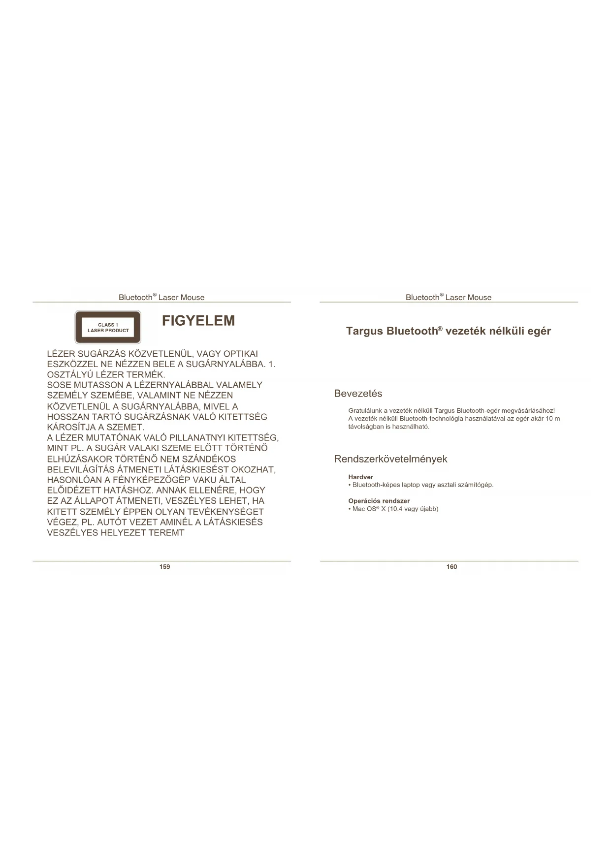 vezeték nélküli egér Bevezetés Gratulálunk a vezeték nélküli Targus Bluetooth-egér megvásárlásához!A vezeték nélküli Bluetooth-technológia használatával az egér akár 10 m távolságban is használható. Rendszerkövetelmények Hardver• Bluetooth-képes laptop vagy asztali számítógép.Operációs rendszer• Mac OS X (10.4 vagy újabb) LÉZER SUGÁRZÁS KÖZVETLENÜL, VAGY OPTIKAI ESZKÖZZEL NE NÉZZEN BELE A SUGÁRNYALÁBBA. 1. OSZTÁLYÚ LÉZER TERMÉK. SOSE MUTASSON A LÉZERNYALÁBBAL VALAMELY SZEMÉLY SZEMÉBE, VALAMINT NE NÉZZEN KÖZVETLENÜL A SUGÁRNYALÁBBA, MIVEL A HOSSZAN TARTÓ SUGÁRZÁSNAK VALÓ KITETTSÉG KÁROSÍTJA A SZEMET. A LÉZER MUTATÓNAK VALÓ PILLANATNYI KITETTSÉG, MINT PL. A SUGÁR VALAKI SZEME ELŐTT TÖRTÉNŐ ELHÚZÁSAKOR TÖRTÉNŐ NEM SZÁNDÉKOS BELEVILÁGÍTÁS ÁTMENETI LÁTÁSKIESÉST OKOZHAT, HASONLÓAN A FÉNYKÉPEZŐGÉP VAKU ÁLTAL ELŐIDÉZETT HATÁSHOZ. ANNAK ELLENÉRE, HOGY EZ AZ ÁLLAPOT ÁTMENETI, VESZÉLYES LEHET, HA KITETT SZEMÉLY ÉPPEN OLYAN TEVÉKENYSÉGET VÉGEZ, PL. AUTÓT VEZET AMINÉL A LÁTÁSKIESÉS