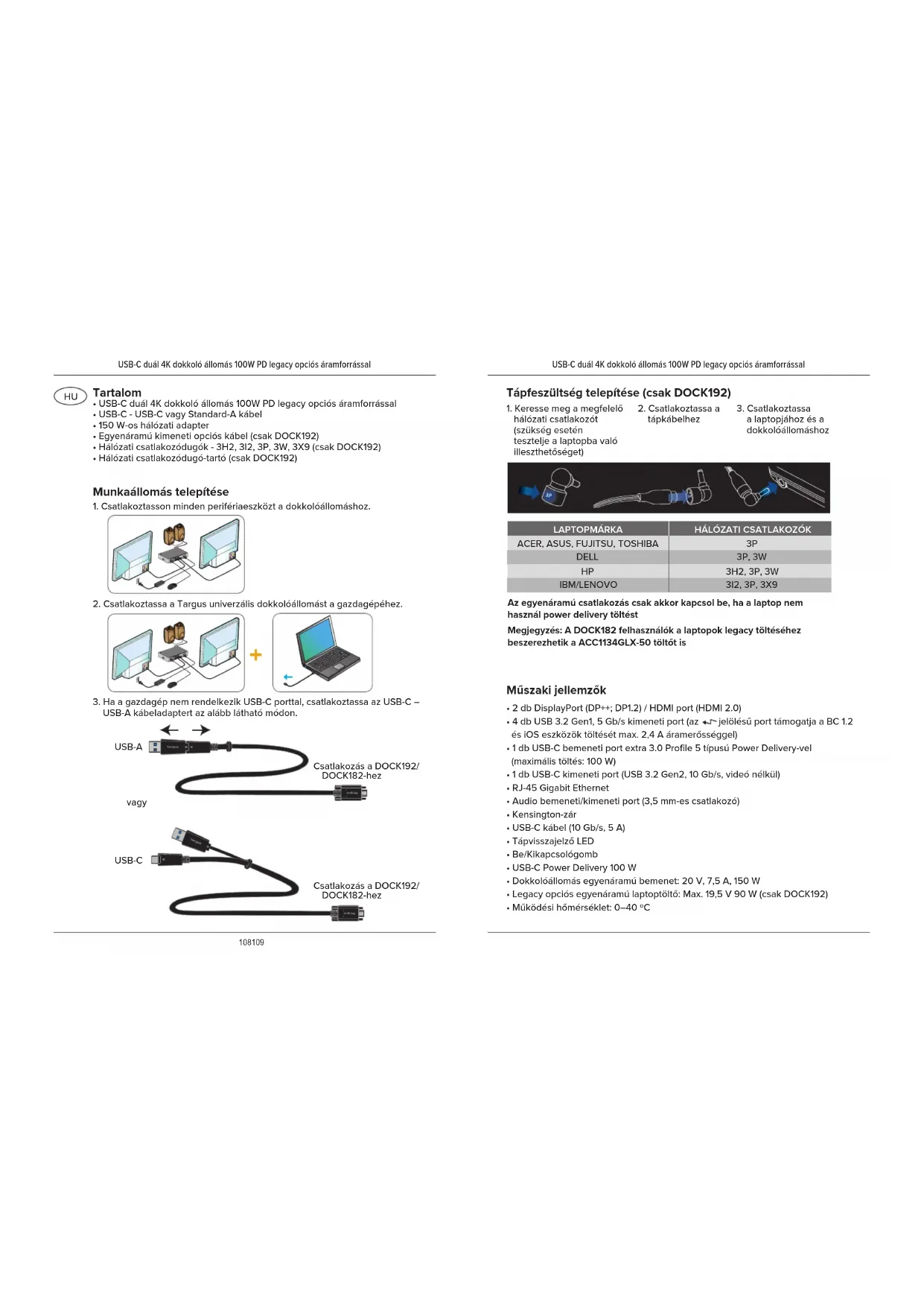USB-A kábeladaptert az alább látható módon. Tápfeszültség telepítése (csak DOCK192) Az egyenáramú csatlakozás csak akkor kapcsol be, ha a laptop nem használ power delivery töltést Megjegyzés: A DOCK182 felhasználók a laptopok legacy töltéséhez beszerezhetik a ACC1134GLX-50 töltőt is Tartalom