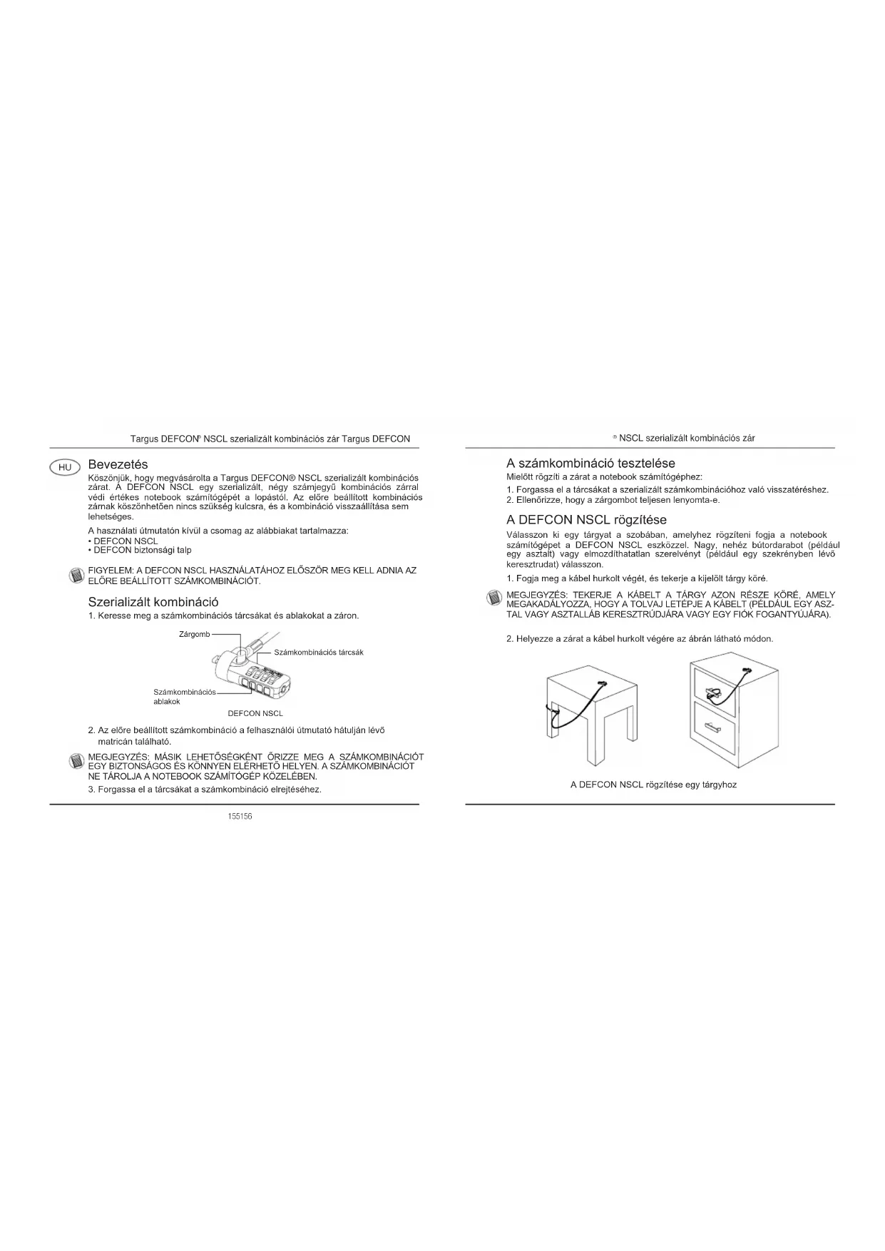 NSCL szerializált kombinációs zár Bevezetés Köszönjük, hogy megvásárolta a Targus DEFCON® NSCL szerializált kombinációs zárat. A DEFCON NSCL egy szerializált, négy számjegyű kombinációs zárral védi értékes notebook számítógépét a lopástól. Az előre beállított kombinációs zárnak köszönhetően nincs szükség kulcsra, és a kombináció visszaállítása sem lehetséges. A használati útmutatón kívül a csomag az alábbiakat tartalmazza:
