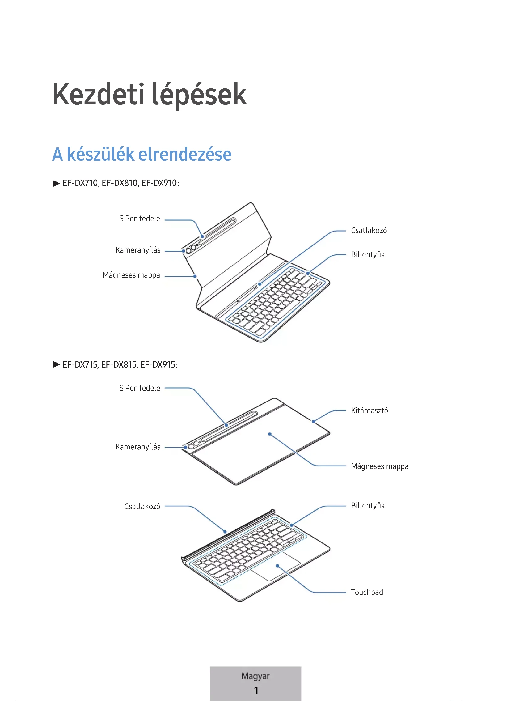 EF-DX715, EF-DX815, EF-DX915: KameranyílásKitámasztóMágneses mappa S Pen fedele Touchpad BillentyűkCsatlakozó Magyar