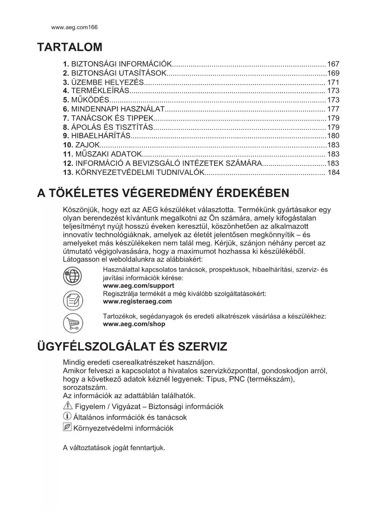 A TÖKÉLETES VÉGEREDMÉNY ÉRDEKÉBEN Köszönjük, hogy ezt az AEG készüléket választotta. Termékünk gyártásakor egy olyan berendezést kívántunk megalkotni az Ön számára, amely kifogástalan teljesítményt nyújt hosszú éveken keresztül, köszönhetően az alkalmazott innovatív technológiáknak, amelyek az életét jelentősen megkönnyítik – és amelyeket más készülékeken nem talál meg. Kérjük, szánjon néhány percet az útmutató végigolvasására, hogy a maximumot hozhassa ki készülékéből. Látogasson el weboldalunkra az alábbiakért: Használattal kapcsolatos tanácsok, prospektusok, hibaelhárítási, szerviz- és javítási információk kérése: www.aeg.com/support Regisztrálja termékét a még kiválóbb szolgáltatásokért: www.registeraeg.com Tartozékok, segédanyagok és eredeti alkatrészek vásárlása a készülékhez: www.aeg.com/shop