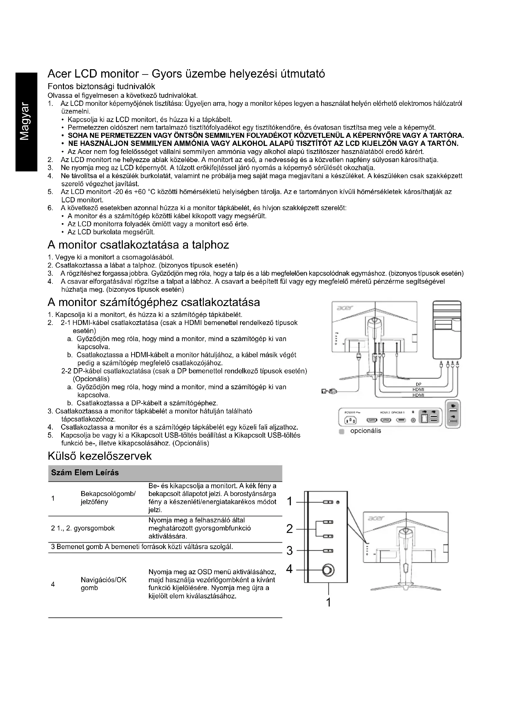 Bemenet Menü/Navigációs/OK Funkciók Fényerő Kontraszt Kék fény Sötét élénkítése ACM HDR Szuper élesség Gamma Színhőmérséklet Módok Színtér Szürkeárnyalatos mód 6 tengelyes színárnyalat 6 tengelyes telítettség Hangerő Némítás Túlhajtás Adaptive-Sync Frissítési frekvencia száma VRB Rendkívül alacsony késleltetés Célzópont Nyelv OSD időkorlátja Átlátszóság OSD zár Bemenet Automatikus forrás DP-formátum Gyorsgomb hozzárendelése Széles mód DDC/CI HDMI Feketeszint Gyorsindítás mód USB-töltés kikapcsolt állapotban Kijelzőinformációk Állítsa vissza az összes beállítást Kilépés A műszaki adatok értesítés nélkül változhatnak.Ελληνικά Οδηγός γρήγορης εγκατάστασης οθόνης LCD Acer (ΟΓΕ) Σημαντικές οδηγίες ασφαλείας ∆ιαβάστε προσεκτικά τις ακόλουθες οδηγίες. 1. Για να καθαρίσετε την οθόνη LCD: Βεβαιωθείτε ότι η οθόνη σας είναι ηλεκτρικά χαρακτηρισμένη για λειτουργία με το εναλλασσόμενο ρεύμα που είναι διαθέσιμο στην περιοχή σας.