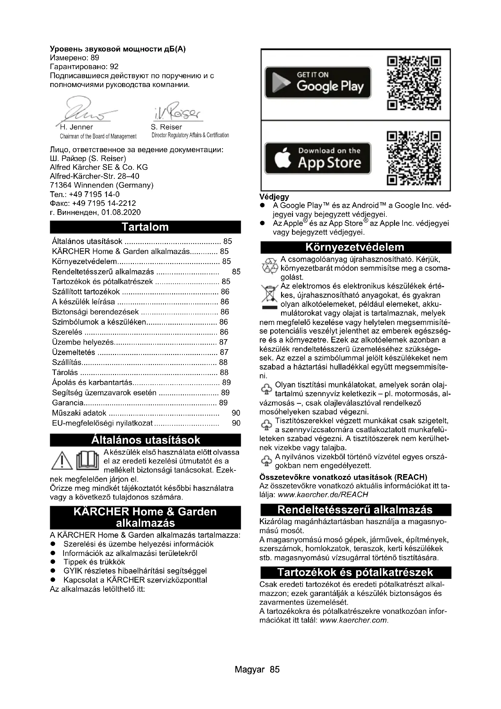 dB(A) 92 92 K 5 Premium Power Control Power ControlMagyar 85 Уровень звуковой мощности дБ(A) Измерено: 89 Гарантировано: 92 Подписавшиеся действуют по поручению и с полномочиями руководства компании. Лицо, ответственное за ведение документации: Ш. Райзер (S. Reiser) Alfred Kärcher SE & Co. KG Alfred-Kärcher-Str. 28–40 71364 Winnenden (Germany) Тел.: +49 7195 14-0 Факс: +49 7195 14-2212 г. Винненден, 01.08.2020 Tartalom Általános utasítások A készülék első használata előtt olvassa el az eredeti kezelési útmutatót és a mellékelt biztonsági tanácsokat. Ezek- nek megfelelően járjon el. Őrizze meg mindkét tájékoztatót későbbi használatra vagy a következő tulajdonos számára. KÄRCHER Home & Garden alkalmazás A KÄRCHER Home & Garden alkalmazás tartalmazza: Szerelési és üzembe helyezési információk Információk az alkalmazási területekről Tippek és trükkök GYIK részletes hibaelhárítási segítséggel Kapcsolat a KÄRCHER szervizközponttal Az alkalmazás letölthető itt: Védjegy A Google Play™ és az Android™ a Google Inc. véd- jegyei vagy bejegyzett védjegyei. Az Apple