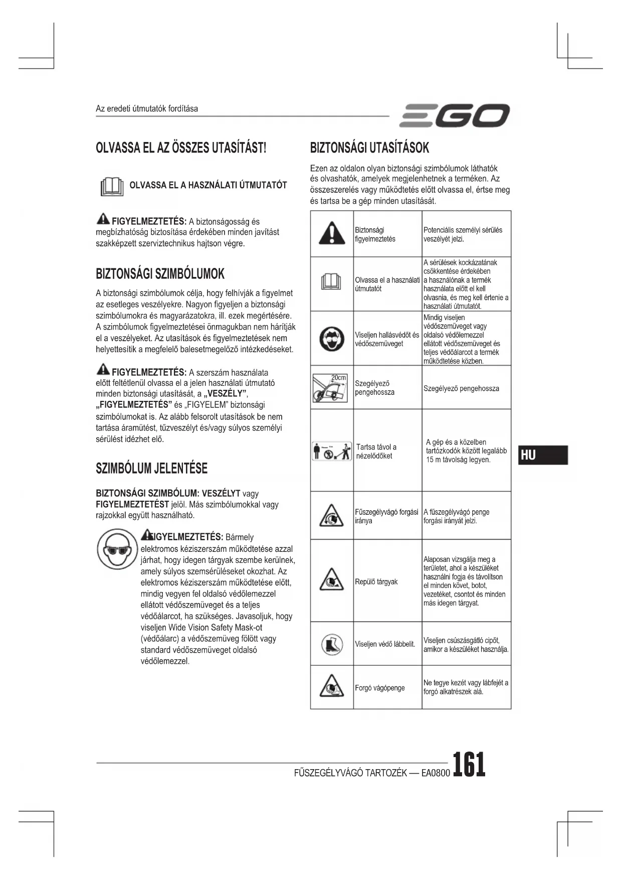 Ezen az oldalon olyan biztonsági szimbólumok láthatók és olvashatók, amelyek megjelenhetnek a terméken. Az összeszerelés vagy működtetés előtt olvassa el, értse meg és tartsa be a gép minden utasítását. Biztonsági gyelmeztetésPotenciális személyi sérülés veszélyét jelzi.Olvassa el a használati útmutatótA sérülések kockázatának csökkentése érdekében a használónak a termék használata előtt el kell olvasnia, és meg kell értenie a használati útmutatót.Viseljen hallásvédőt és védőszemüvegetMindig viseljen védőszemüveget vagy oldalsó védőlemezzel ellátott védőszemüveget és teljes védőálarcot a termék működtetése közben. 20cm Szegélyező pengehosszaSzegélyező pengehossza 15m Tartsa távol a nézelődőketA gép és a közelben tartózkodók között legalább 15 m távolság legyen.Fűszegélyvágó forgási irányaA fűszegélyvágó penge forgási irányát jelzi.Repülő tárgyakAlaposan vizsgálja meg a területet, ahol a készüléket használni fogja és távolítson el minden követ, botot, vezetéket, csontot és minden más idegen tárgyat.Viseljen védő lábbelit.Viseljen csúszásgátló cipőt, amikor a készüléket használja.Forgó vágópengeNe tegye kezét vagy lábfejét a forgó alkatrészek alá. Az eredeti útmutatók fordításaFŰSZEGÉLYVÁGÓ TARTOZÉK — EA0800162