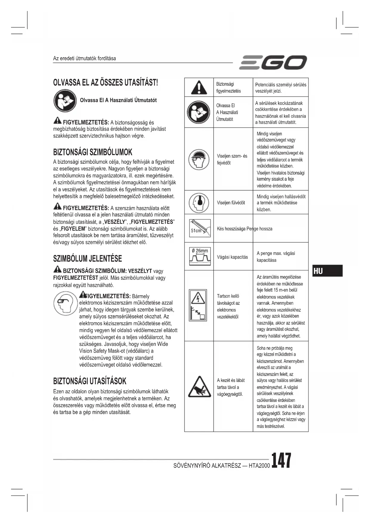 Ezen az oldalon olyan biztonsági szimbólumok láthatók és olvashatók, amelyek megjelenhetnek a terméken. Az összeszerelés vagy működtetés előtt olvassa el, értse meg és tartsa be a gép minden utasítását. Biztonsági gyelmeztetésPotenciális személyi sérülés veszélyét jelzi.Olvassa El A Használati ÚtmutatótA sérülések kockázatának csökkentése érdekében a használónak el kell olvasnia a használati útmutatót.Viseljen szem- és fejvédőtMindig viseljen védőszemüveget vagy oldalsó védőlemezzel ellátott védőszemüveget és teljes védőálarcot a termék működtetése közben. Viseljen hivatalos biztonsági kemény sisakot a feje védelme érdekében.Viseljen fülvédőtMindig viseljen hallásvédőt a termék működtetése közben. 51cm Kés hosszúsága Penge hosszaVágási kapacitásA penge max. vágási kapacitásaTartson kellő távolságot az elektromos vezetékektőlAz áramütés megelőzése érdekében ne működtesse feje felett 15 m-en belül elektromos vezetékek vannak. Amennyiben elektromos vezetékekhez ér, vagy azok közelében használja, akkor az sérülést vagy áramütést okozhat, amely halállal végződhet.A kezét és lábát tartsa távol a vágóegységtől.Soha ne próbálja meg egy kézzel működtetni a kéziszerszámot. Amennyiben elveszíti az uralmát a kéziszerszám felett, az súlyos vagy halálos sérülést eredményezhet. A vágási sérülések veszélyének csökkentése érdekében tartsa távol a kezét és lábát a vágóegységtől. Soha ne érjen a vágóegységhez kézzel vagy más testrészével. Az eredeti útmutatók fordításaSÖVÉNYNYÍRÓ ALKATRÉSZ — HTA2000148