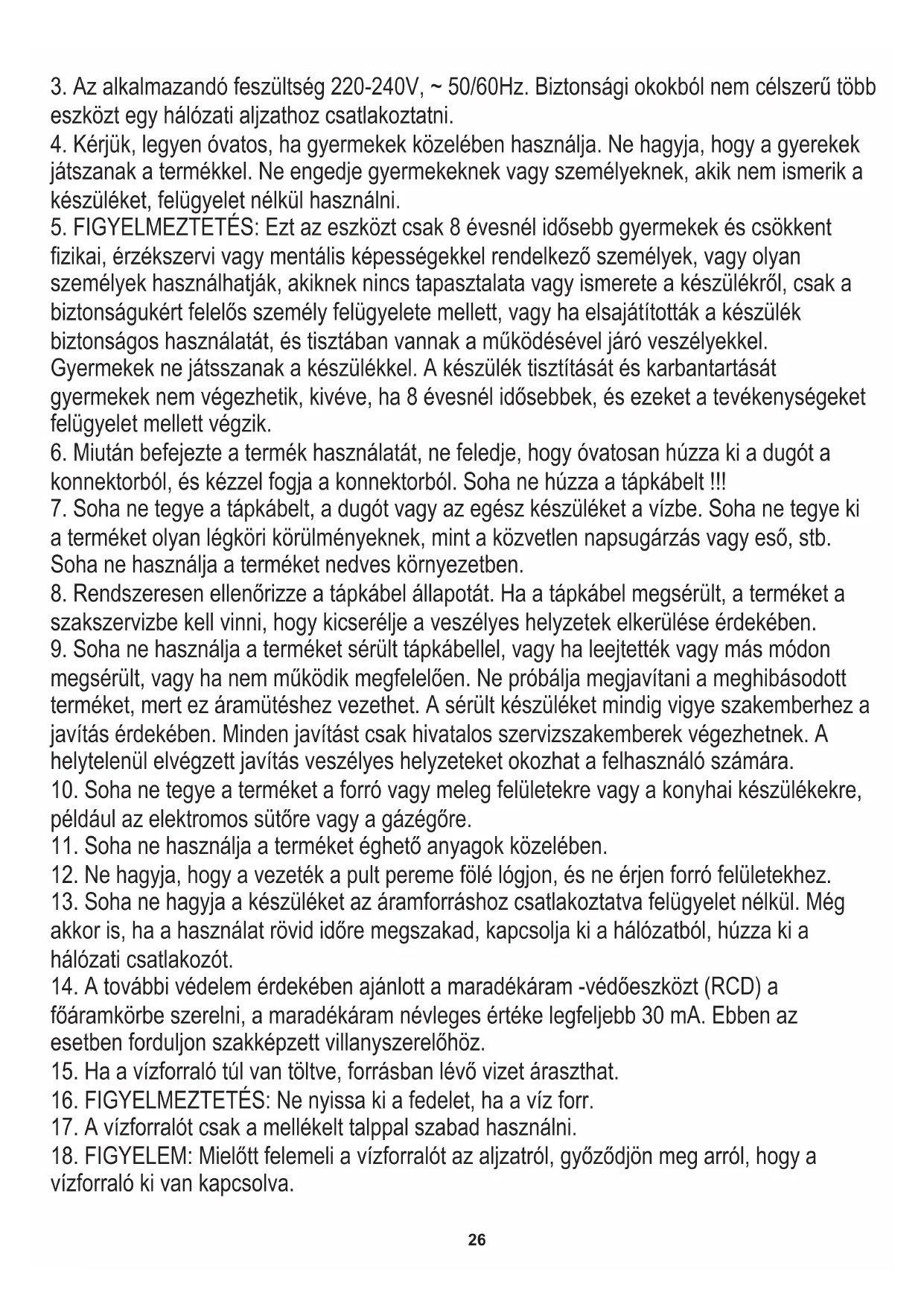 fizikai, érzékszervi vagy mentális képességekkel rendelkező személyek, vagy olyan személyek használhatják, akiknek nincs tapasztalata vagy ismerete a készülékről, csak a biztonságukért felelős személy felügyelete mellett, vagy ha elsajátították a készülék biztonságos használatát, és tisztában vannak a működésével járó veszélyekkel. Gyermekek ne játsszanak a készülékkel. A készülék tisztítását és karbantartását gyermekek nem végezhetik, kivéve, ha 8 évesnél idősebbek, és ezeket a tevékenységeket felügyelet mellett végzik.