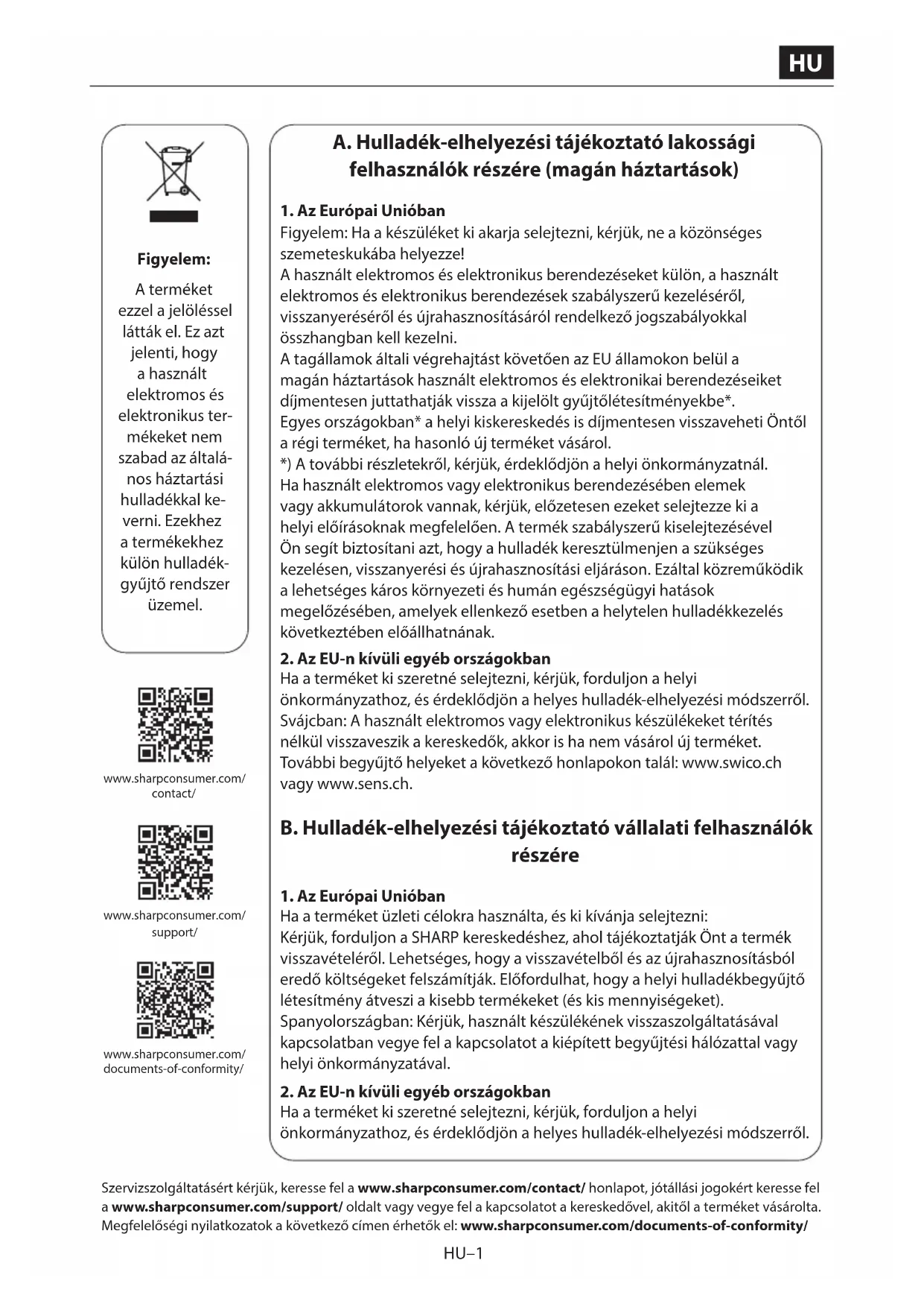 Ha a terméket ki szeretné selejtezni, kérjük, forduljon a helyi önkormányzathoz, és érdeklődjön a helyes hulladék-elhelyezési módszerről. Szervizszolgáltatásért kérjük, keresse fel a www.sharpconsumer.com/contact/ honlapot, jótállási jogokért keresse fel a www.sharpconsumer.com/support/ oldalt vagy vegye fel a kapcsolatot a kereskedővel, akitől a terméket vásárolta. Megfelelőségi nyilatkozatok a következő címen érhetők el: www.sharpconsumer.com/documents-of-conformity/ www.sharpconsumer.com/support/www.sharpconsumer.com/documents-of-conformity/www.sharpconsumer.com/contact/HU–2 HU–2 BIZTONSÁGI ÓVINTÉZKEDÉSEK A MIKROHULLÁMÚ SUGÁRZÁS