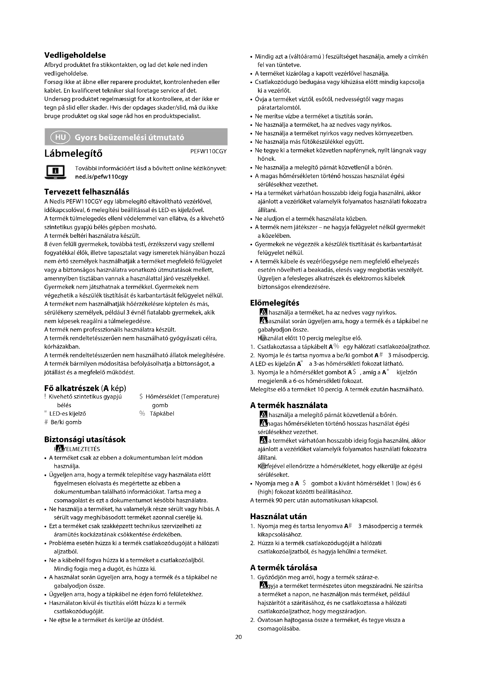 Gyors beüzemelési útmutató Lábmelegítő PEFW110CGYTovábbi információért lásd a bővített online kézikönyvet: ned.is/pefw110cgy Tervezett felhasználás A Nedis PEFW110CGY egy lábmelegítő eltávolítható vezérlővel, időkapcsolóval, 6 melegítési beállítással és LED-es kijelzővel.A termék túlmelegedés elleni védelemmel van ellátva, és a kivehető szintetikus gyapjú bélés gépben mosható.A termék beltéri használatra készült.8 éven felüli gyermekek, továbbá testi, érzékszervi vagy szellemi fogyatékkal élők, illetve tapasztalat vagy ismeretek hiányában hozzá nem értő személyek használhatják a terméket megfelelő felügyelet vagy a biztonságos használatra vonatkozó útmutatások mellett, amennyiben tisztában vannak a használattal járó veszélyekkel. Gyermekek nem játszhatnak a termékkel. Gyermekek nem végezhetik a készülék tisztítását és karbantartását felügyelet nélkül.A terméket nem használhatják hőérzékelésre képtelen és más, sérülékeny személyek, például 3 évnél atalabb gyermekek, akik nem képesek reagálni a túlmelegedésre.A termék nem professzionális használatra készült.A termék rendeltetésszerűen nem használható gyógyászati célra, kórházakban.A termék rendeltetésszerűen nem használható állatok melegítésére.A termék bármilyen módosítása befolyásolhatja a biztonságot, a jótállást és a megfelelő működést. Fő alkatrészek (A kép) 1 Kivehető szintetikus gyapjú bélés2 LED-es kijelző3 Be/ki gomb4 Hőmérséklet (Temperature) gomb 5 Tápkábel Biztonsági utasítások