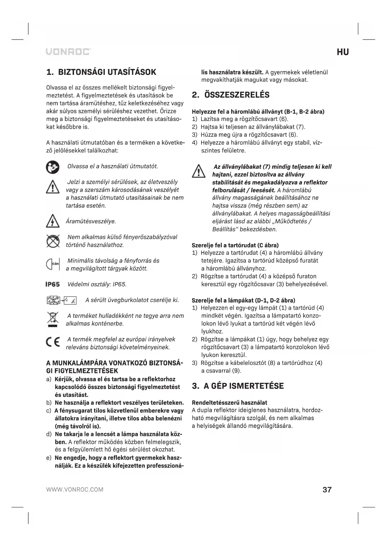Rendeltetésszerű használat Adupla reflektor ideiglenes használatra, hordoz- ható megvilágításra szolgál, és nem alkalmas ahelyiségek állandó megvilágítására.38